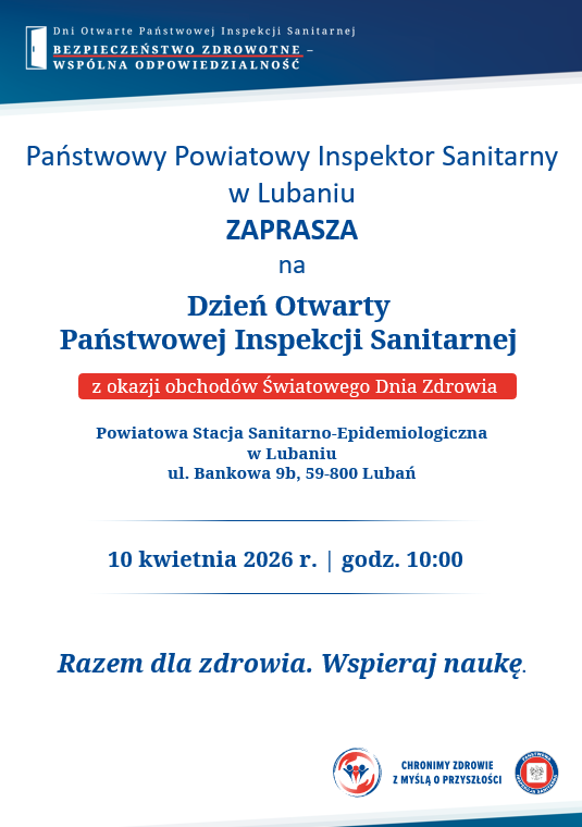 Państwowy Powiatowy Inspektor Sanitarny w Lubaniu zaprasza na Dni Otwarte w zwiazku z obchodami Światowego Dnia Zdrowia, które odbędą się 10 kwietnia 2026 o godz. 10: 00. Ponadto zapraszamy już 09 kwietnia do naszego Punktu Informacyjnego działającego na terenie PSSE w Lubaniu.
