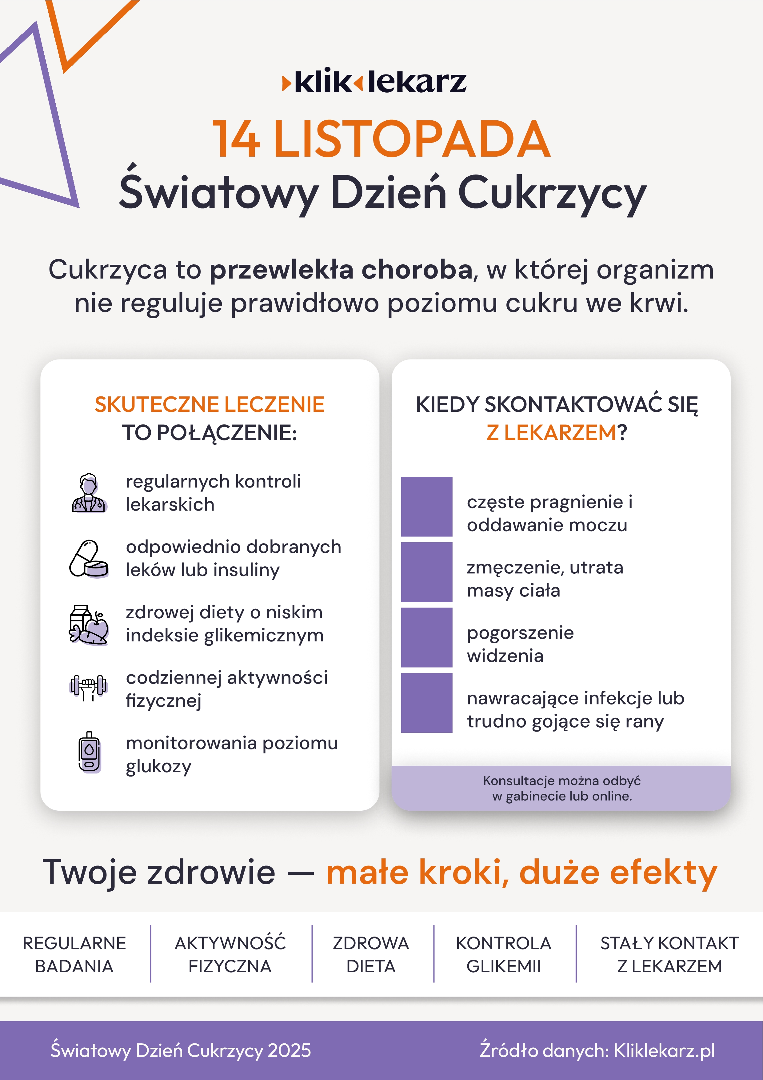 Światowy Dzień Walki z Cukrzycą przypomina, jak ważne jest wczesne rozpoznanie objawów, świadoma profilaktyka oraz dostęp do skutecznych metod leczenia. Nowoczesne podejście terapeutyczne pozwala wielu pacjentom prowadzić aktywne i bezpieczne życie, a w części przypadków znacząco spowalnia rozwój choroby.