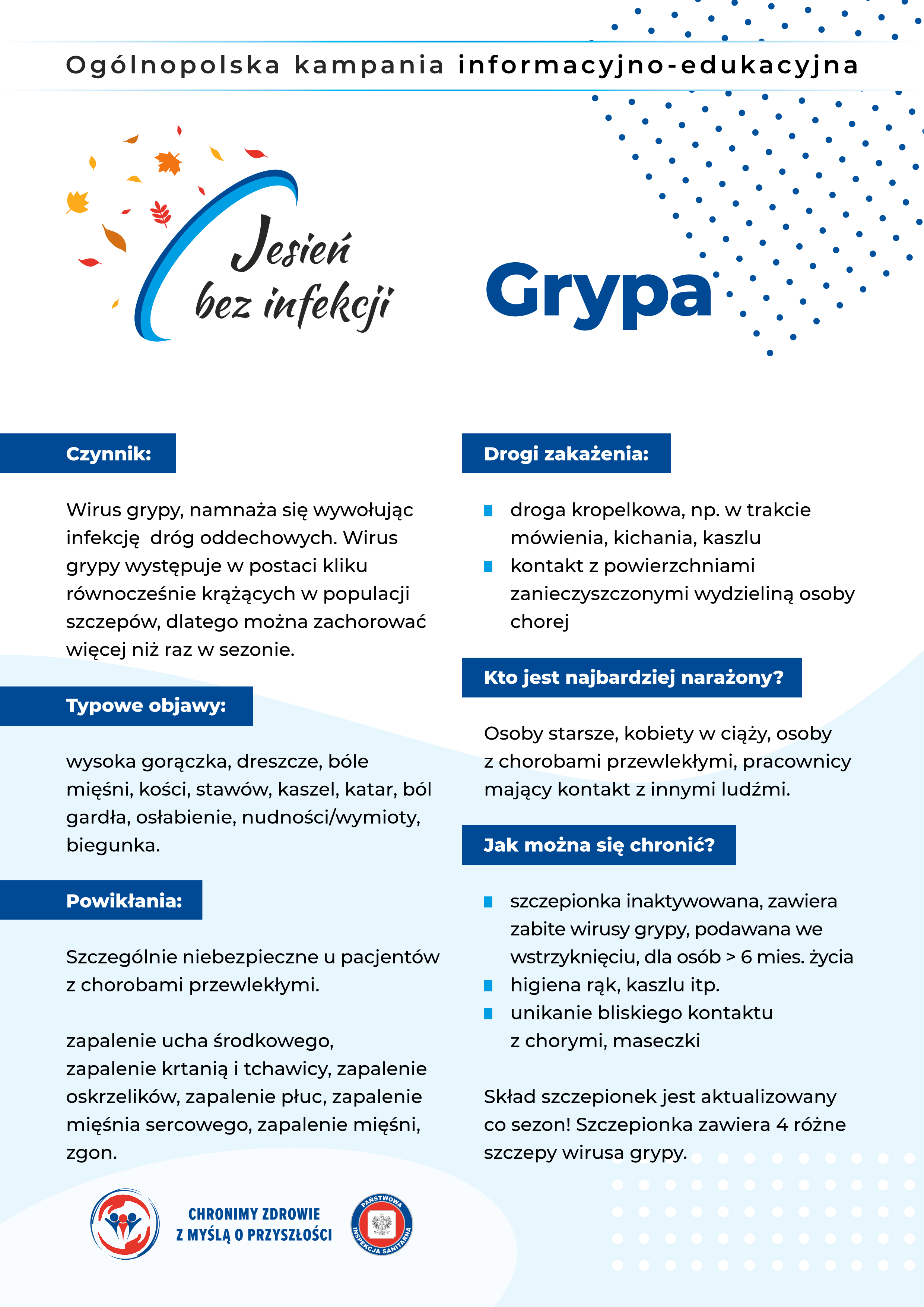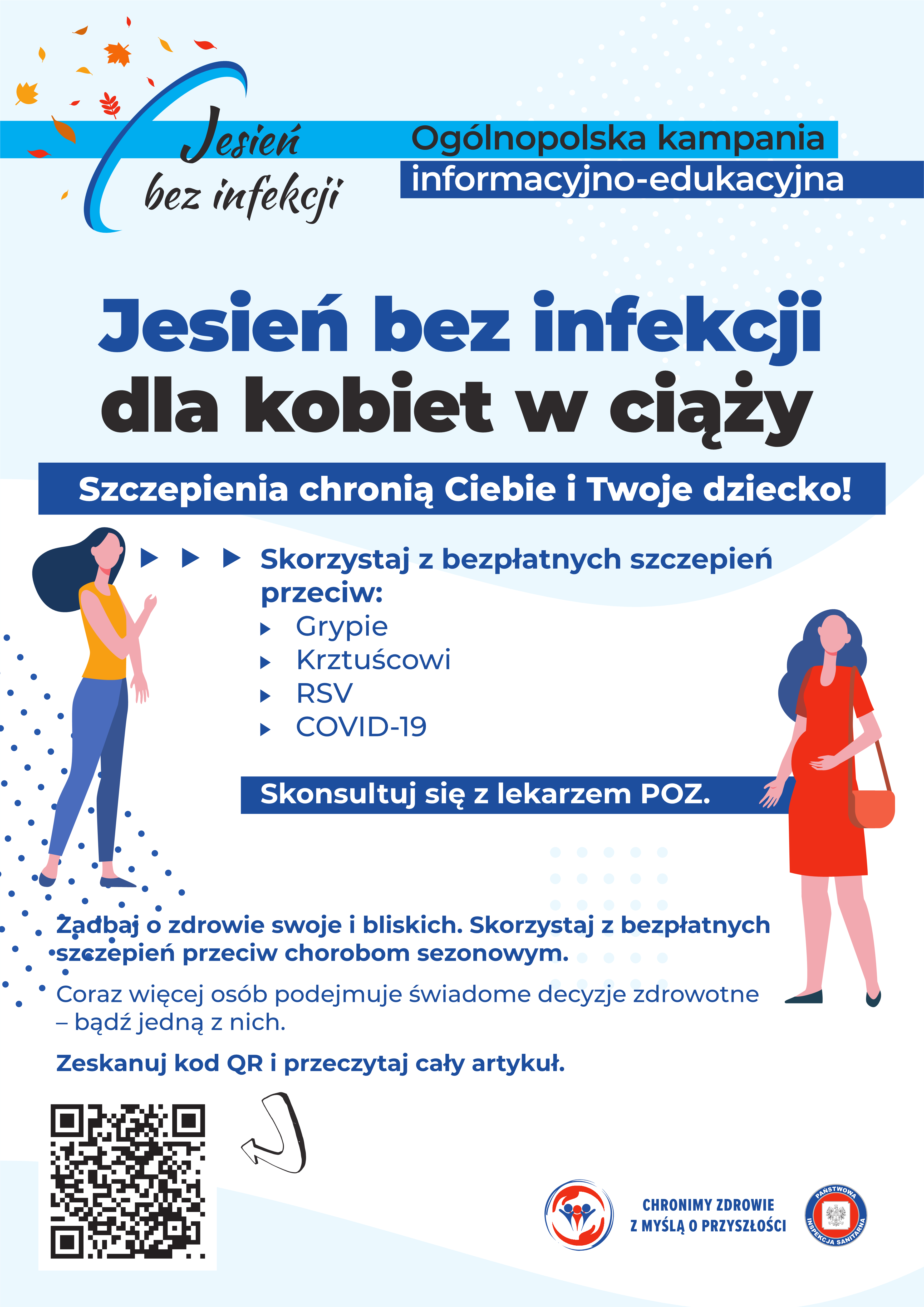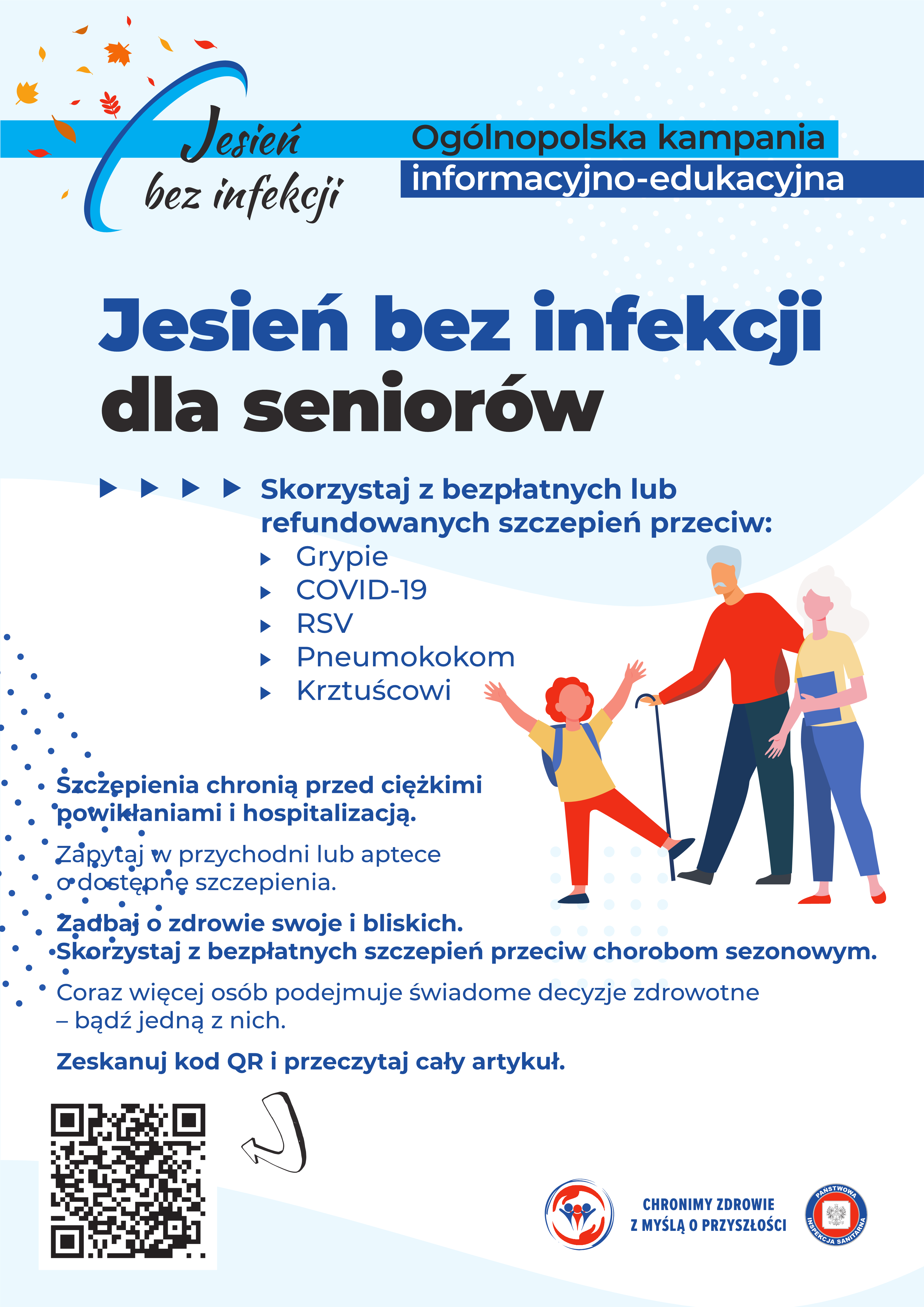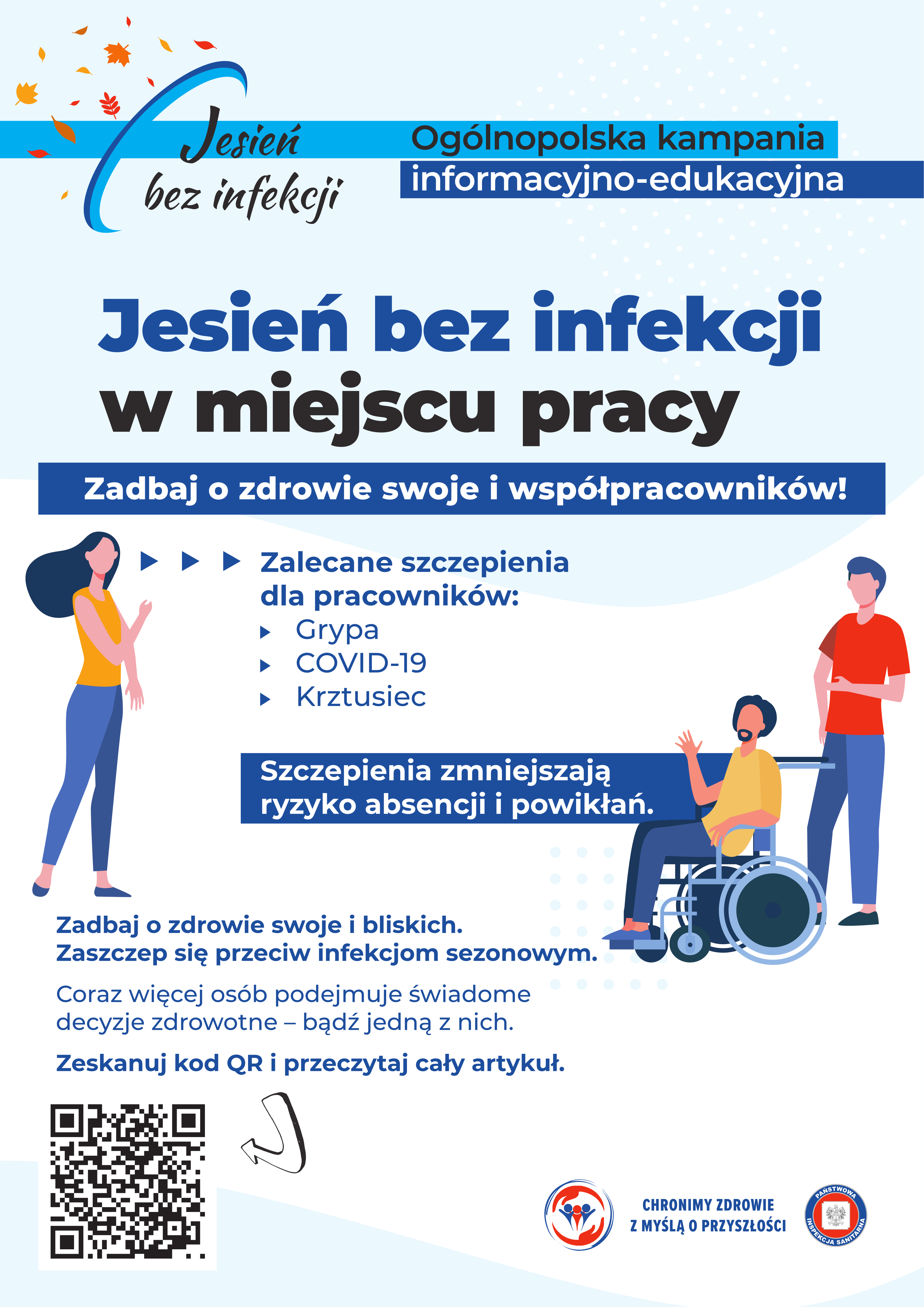 Zachęcamy do udziału w kampanii „Jesień bez infekcji” – bądźcie jej częścią, śledźcie nasze media społecznościowe i udostępniajcie materiały. Celem kampanii jest promocja szczepień ochronnych wśród osób najbardziej narażonych na powikłania – seniorów, kobiet w ciąży, a także ogółu społeczeństwa ze szczególnym uwzględnieniem pracowników i pracodawców. Wspólnie możemy zwiększyć świadomość zdrowotną i zadbać o odporność w sezonie jesienno-zimowym.