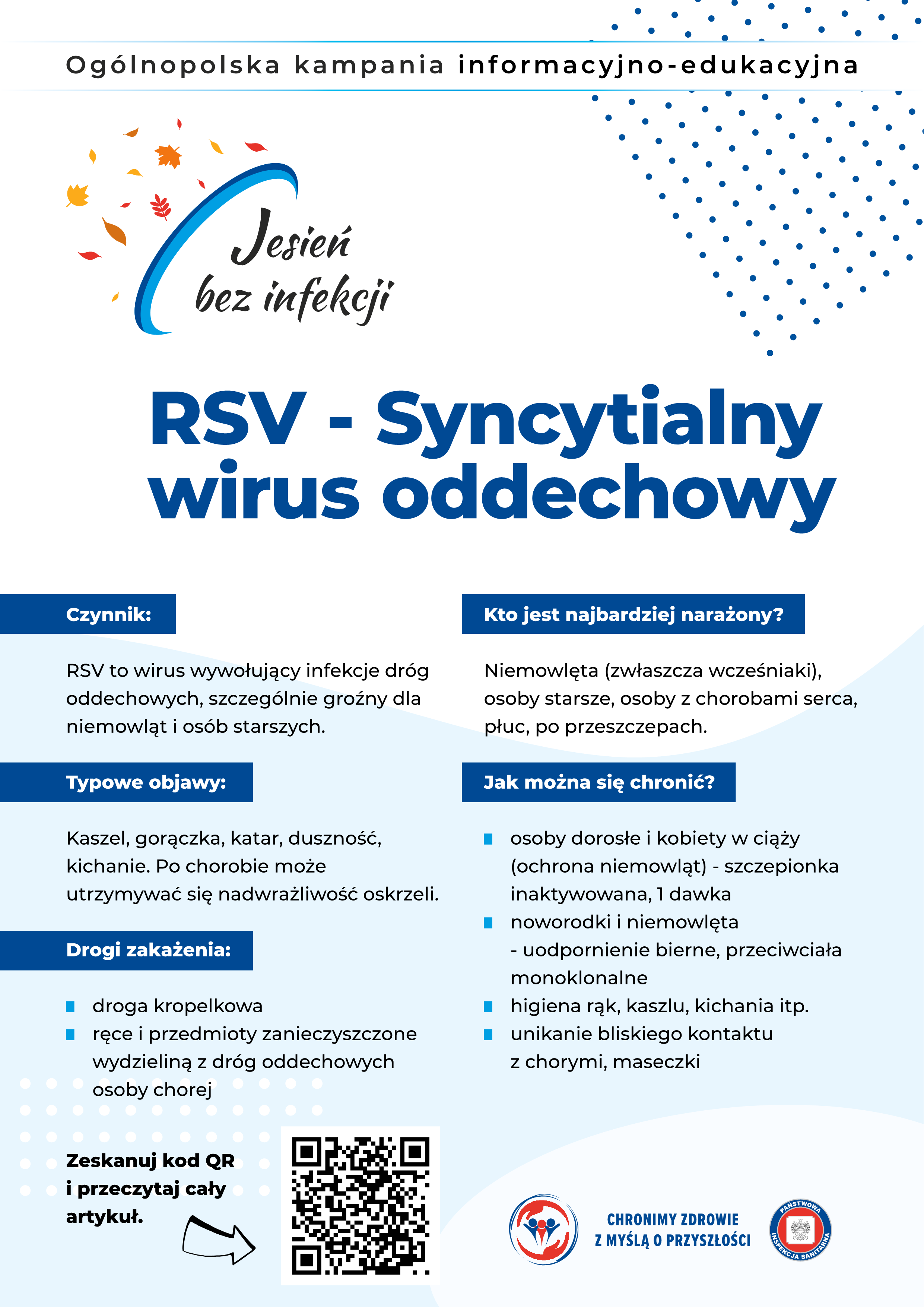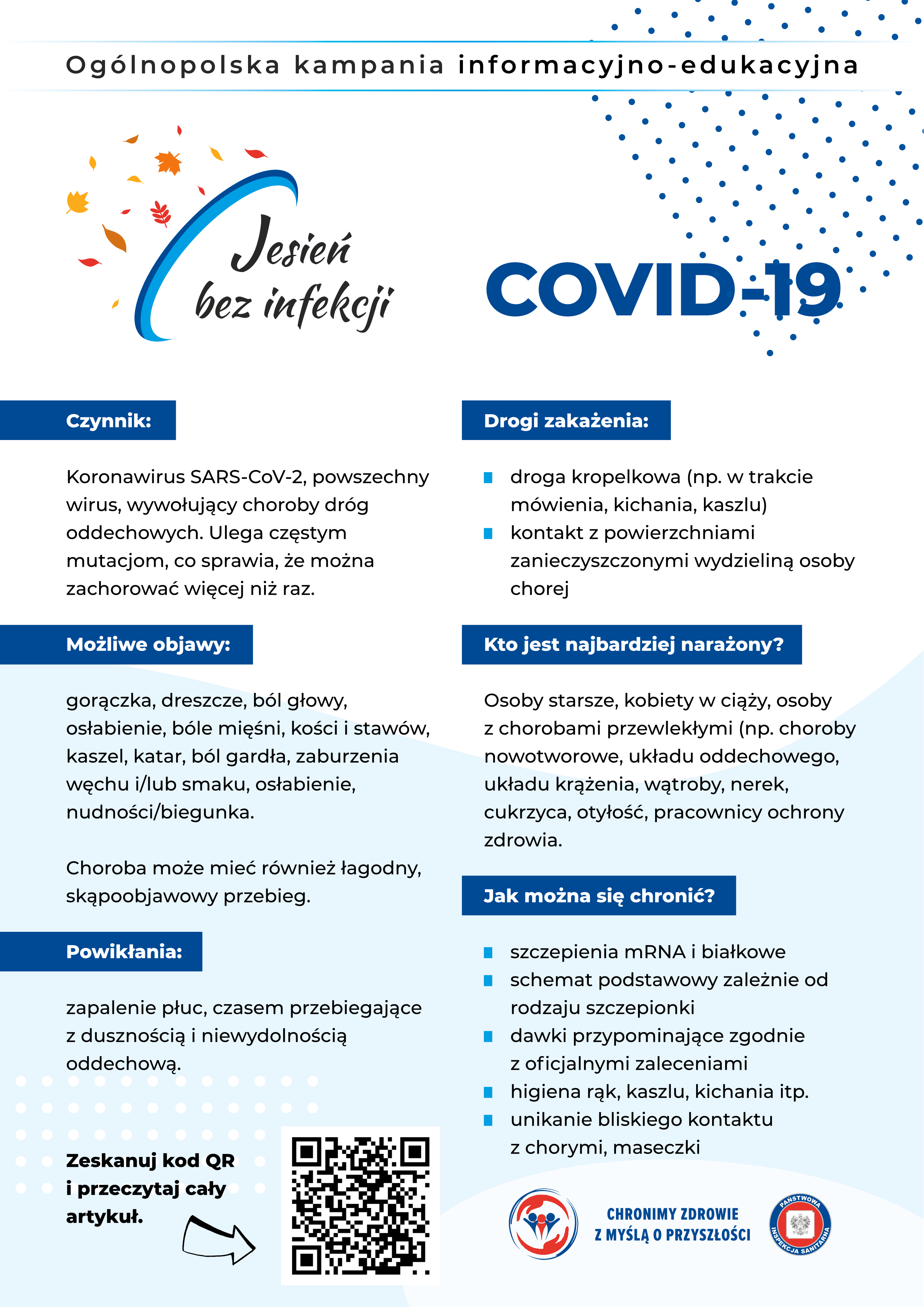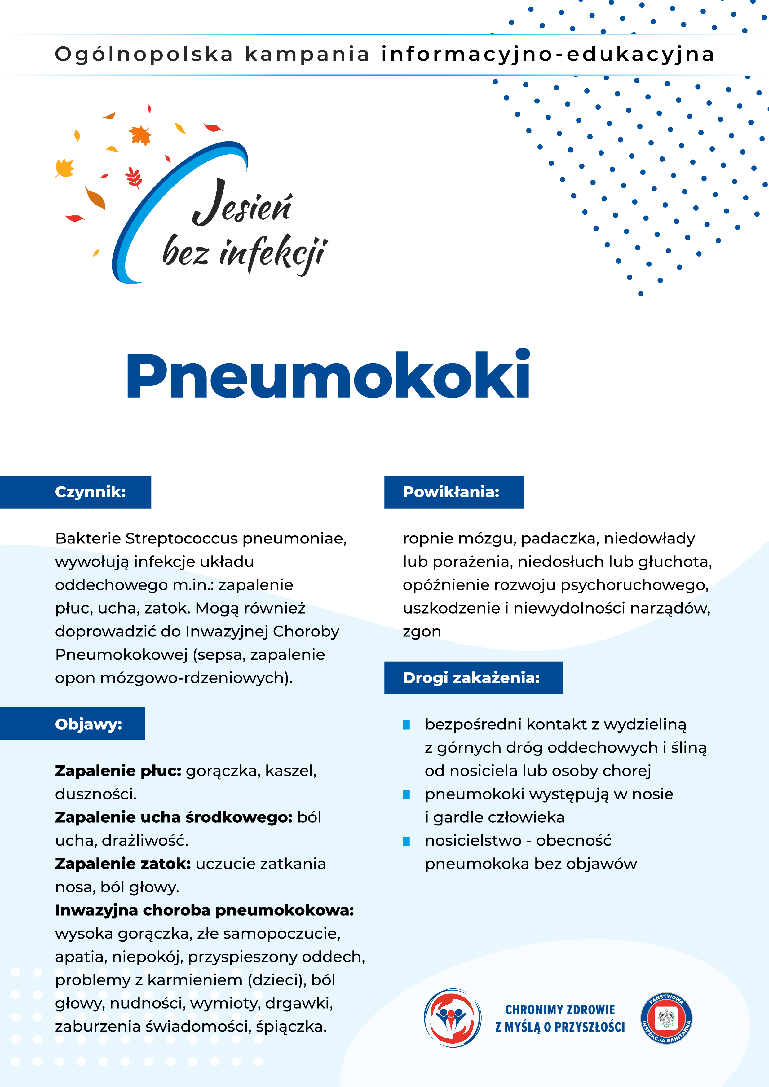 Zachęcamy do udziału w kampanii „Jesień bez infekcji” – bądźcie jej częścią, śledźcie nasze media społecznościowe i udostępniajcie materiały. Celem kampanii jest promocja szczepień ochronnych wśród osób najbardziej narażonych na powikłania – seniorów, kobiet w ciąży, a także ogółu społeczeństwa ze szczególnym uwzględnieniem pracowników i pracodawców. Wspólnie możemy zwiększyć świadomość zdrowotną i zadbać o odporność w sezonie jesienno-zimowym.