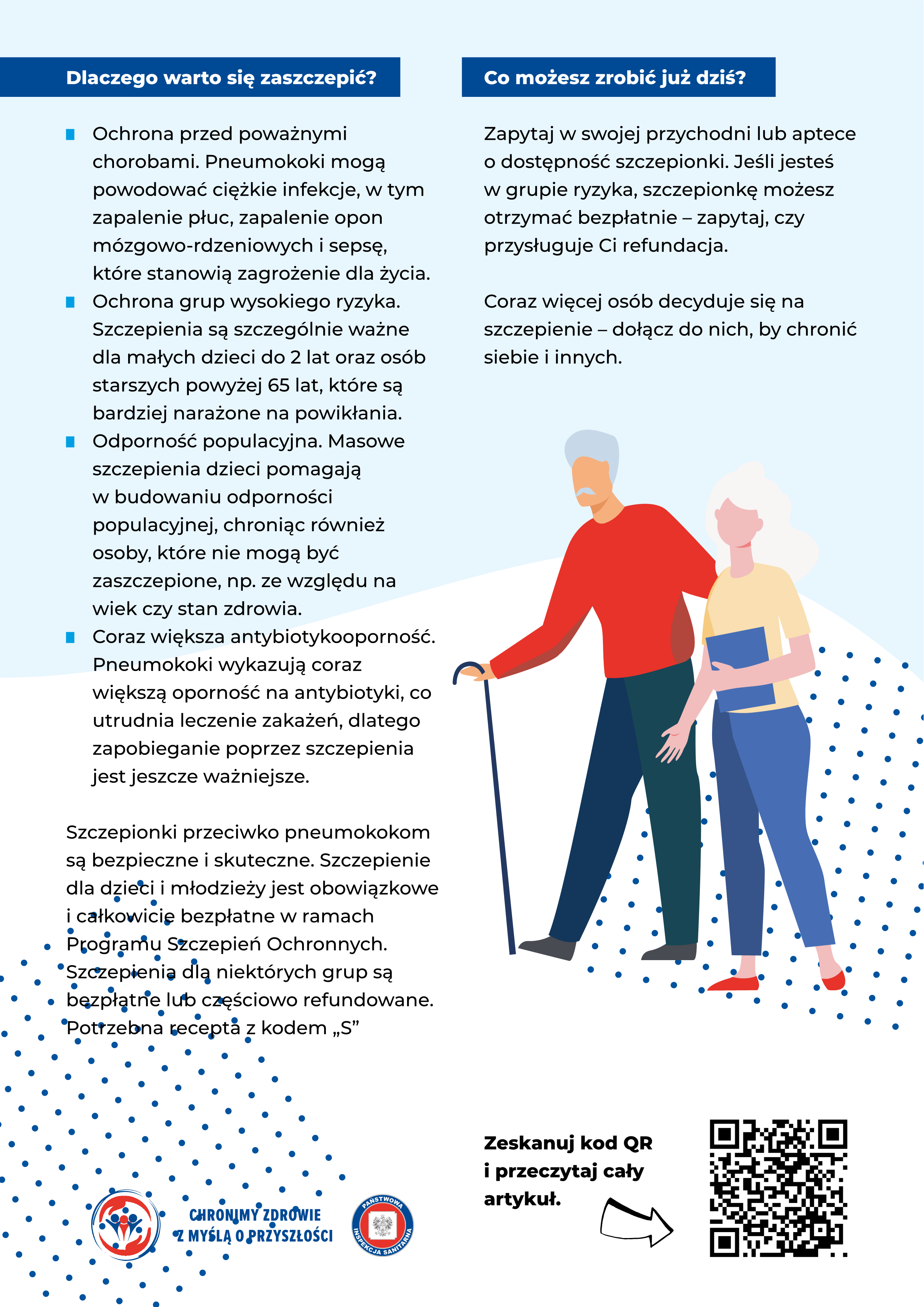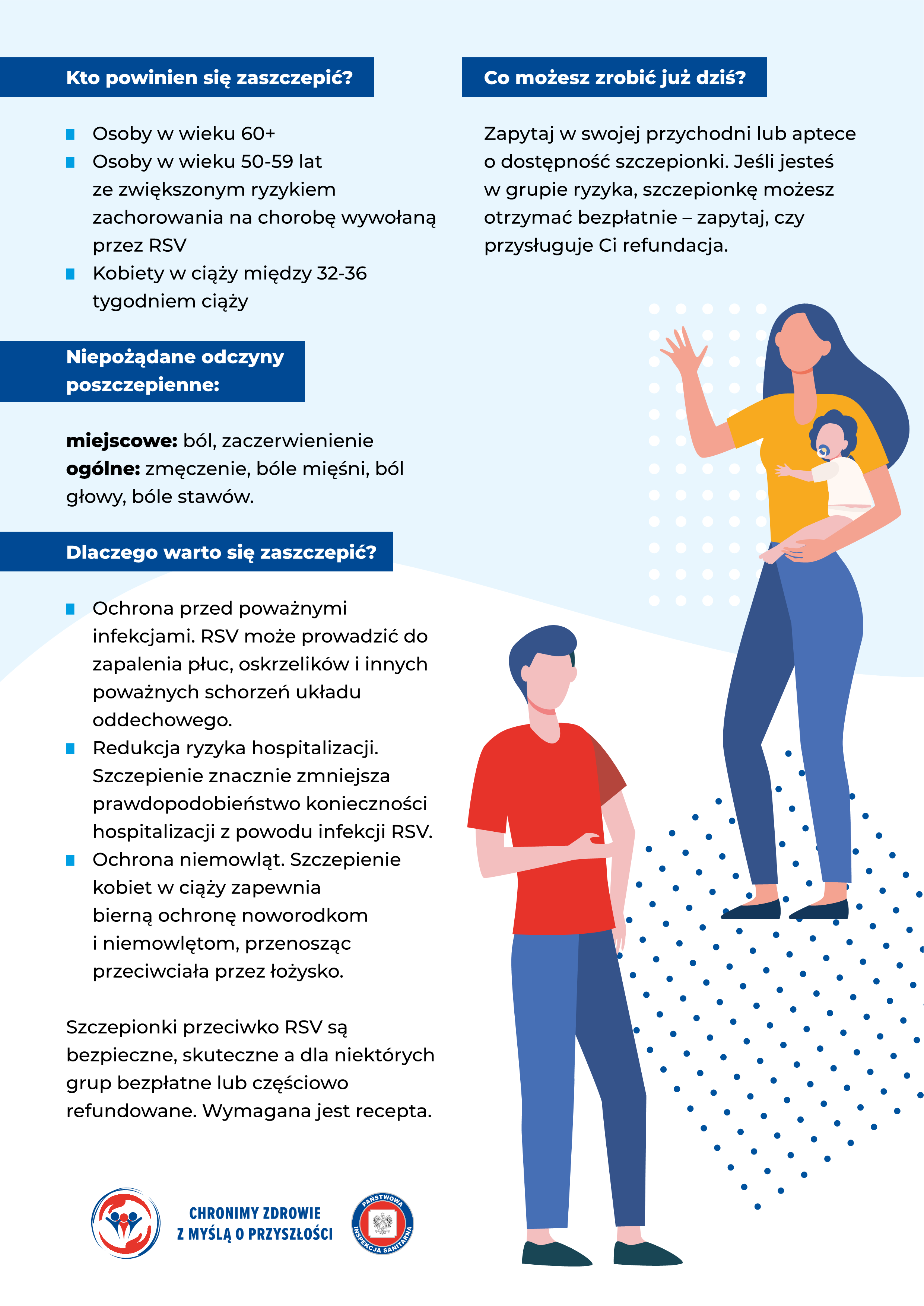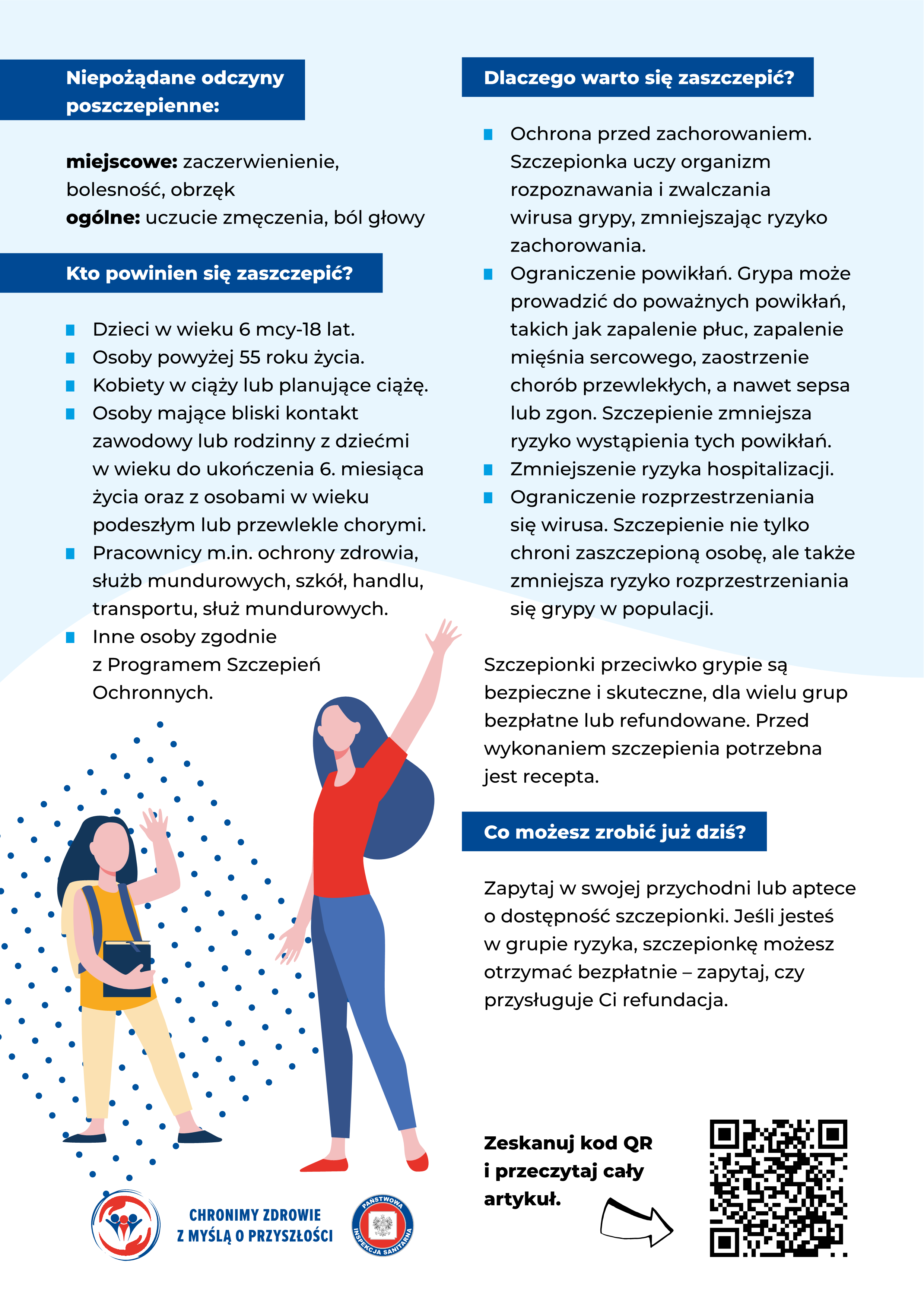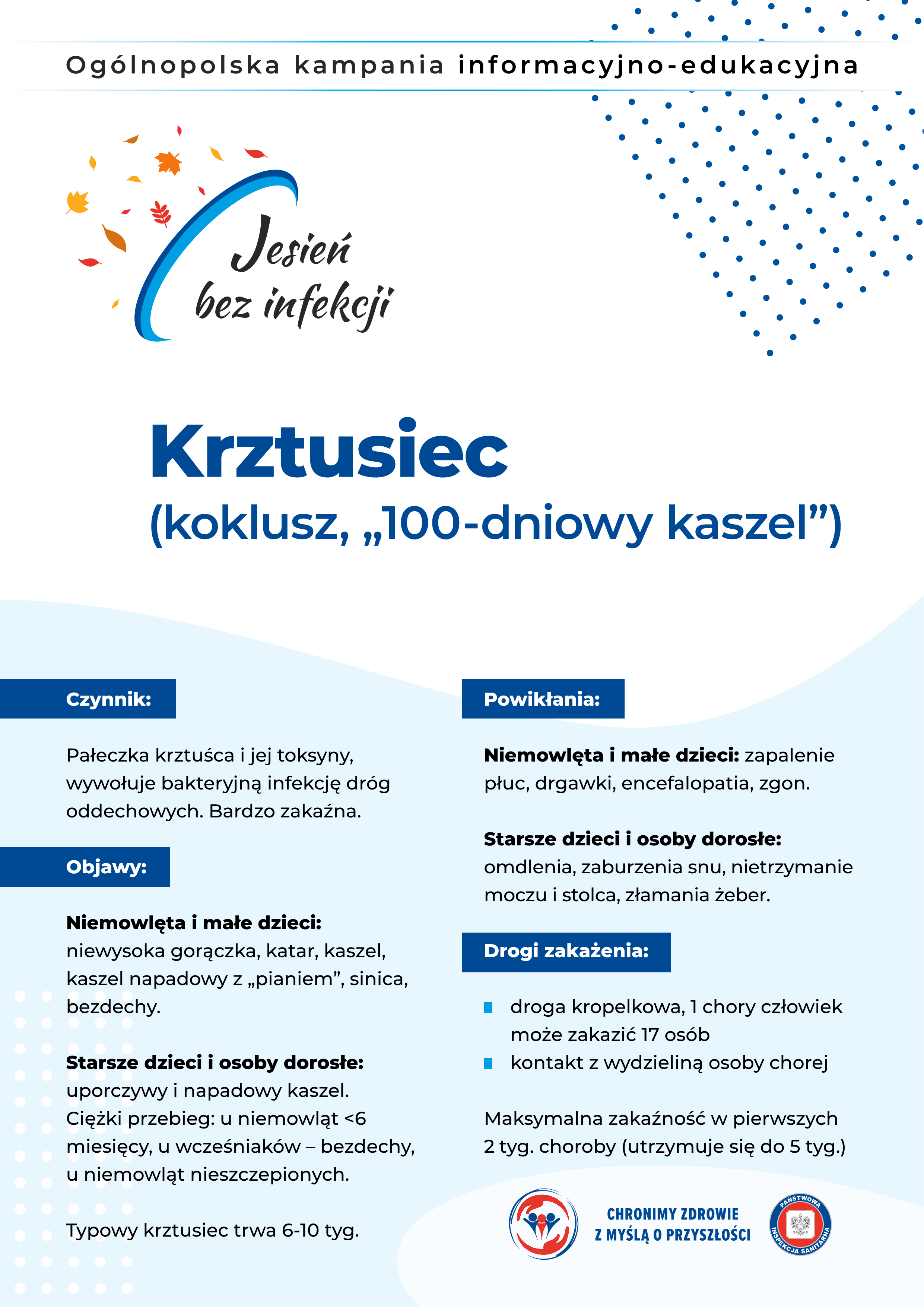 Zachęcamy do udziału w kampanii „Jesień bez infekcji” – bądźcie jej częścią, śledźcie nasze media społecznościowe i udostępniajcie materiały. Celem kampanii jest promocja szczepień ochronnych wśród osób najbardziej narażonych na powikłania – seniorów, kobiet w ciąży, a także ogółu społeczeństwa ze szczególnym uwzględnieniem pracowników i pracodawców. Wspólnie możemy zwiększyć świadomość zdrowotną i zadbać o odporność w sezonie jesienno-zimowym.