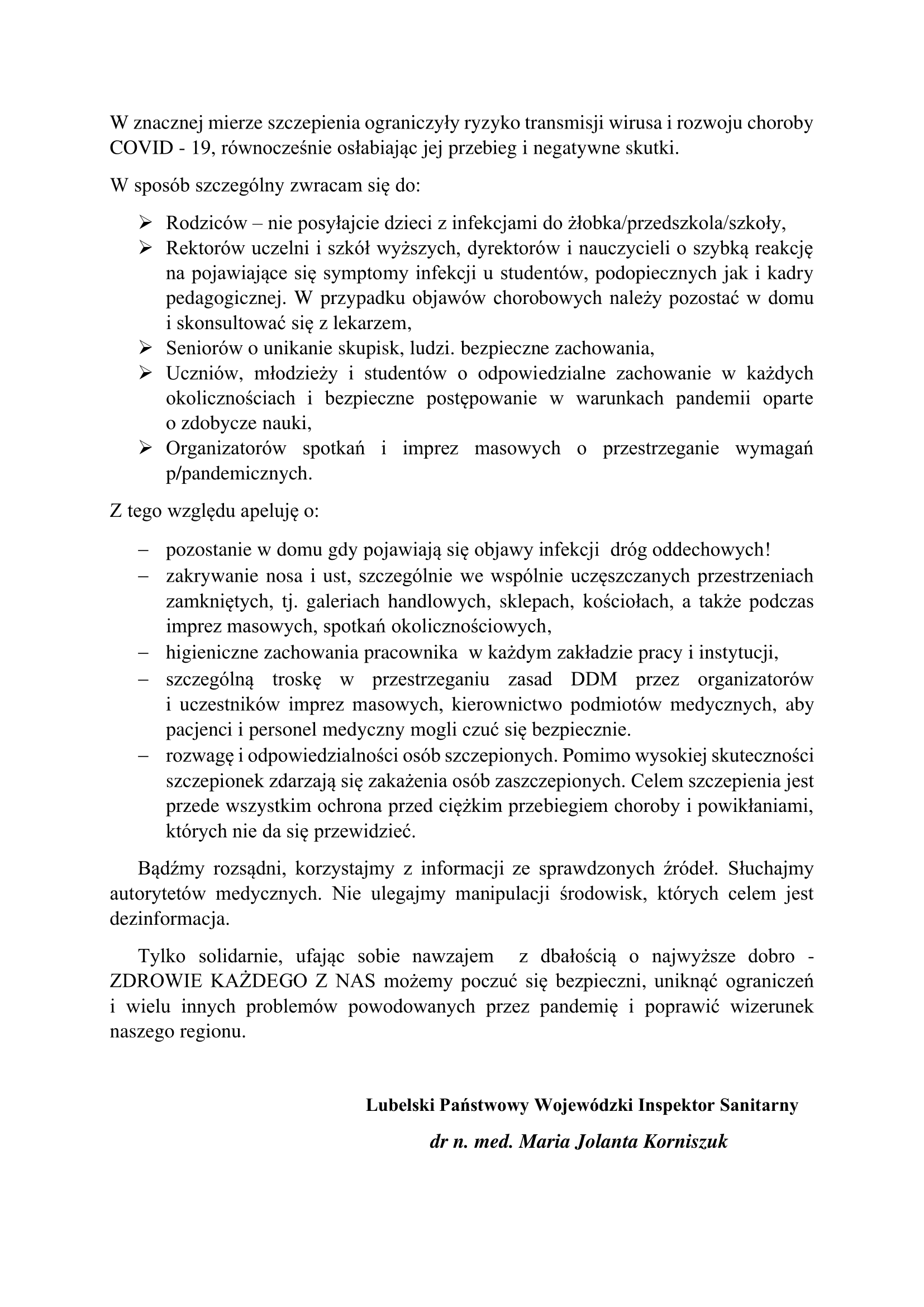 Dlatego apeluję, do każdego z osobna o odpowiedzialność i o zaufanie nauce: zaszczepienie się przeciw COVID - 19 i przestrzeganie obowiązujących zaleceń. Szczepienia w wielu krajach zminimalizowały liczbę zgonów i hospitalizacji.