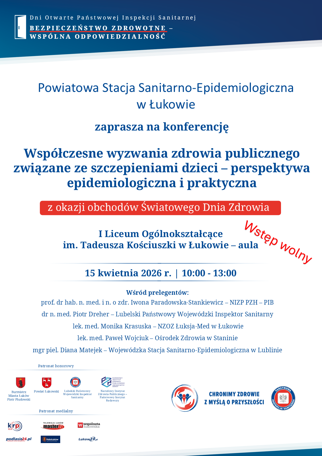 Zaproszenie na konferencję "Współczesne wyzwania zdrowia publicznego związane ze szczepieniami dzieci - perspektywa epidemiologiczna i praktyczna" z okazji obchodów Światowego Dnia Zdrowia.