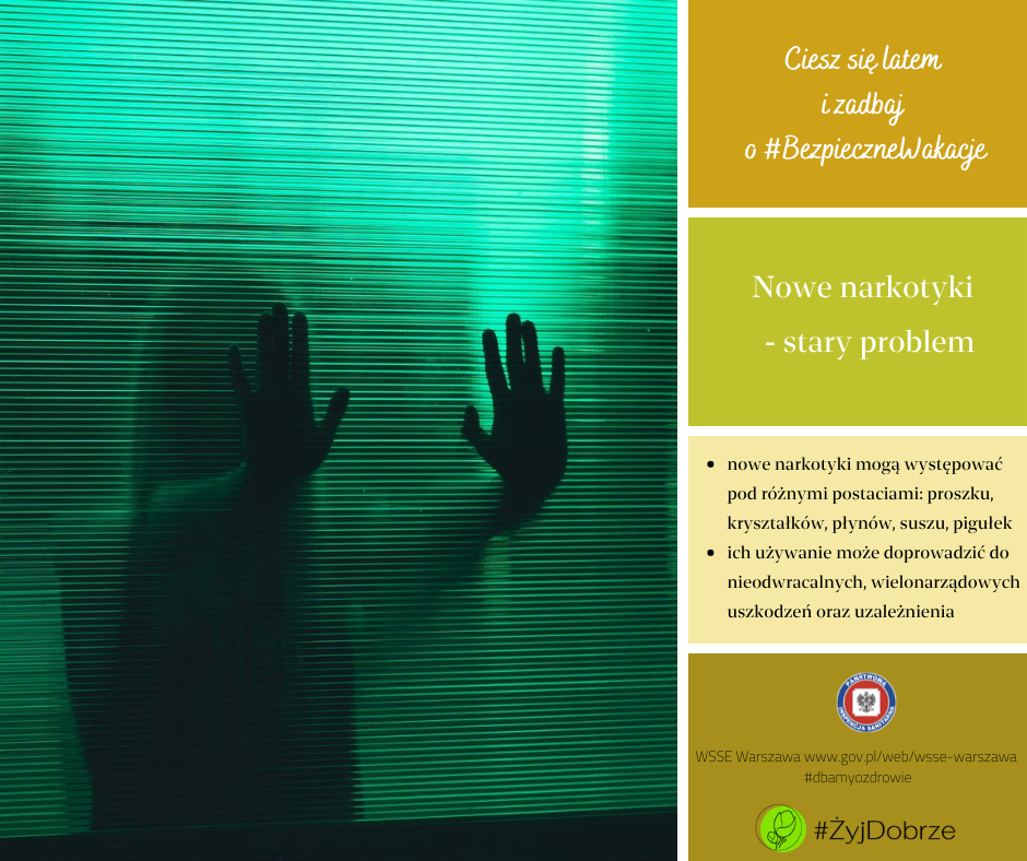 Wakacyjne odprężenie i chęć poznawania nowego może spowodować, że młody człowiek skusi się na eksperymenty z nowymi narkotykami (NN - wcześniej nazywane dopalaczami. Ich stosowanie jest ryzykowne, działa na ośrodkowy układ nerwowy (OUN), co w konsekwencji może doprowadzić do podejmowania błędnych decyzji i nieadekwatnych do sytuacji reakcji, a także zaburzeń i zachowań problemowych.