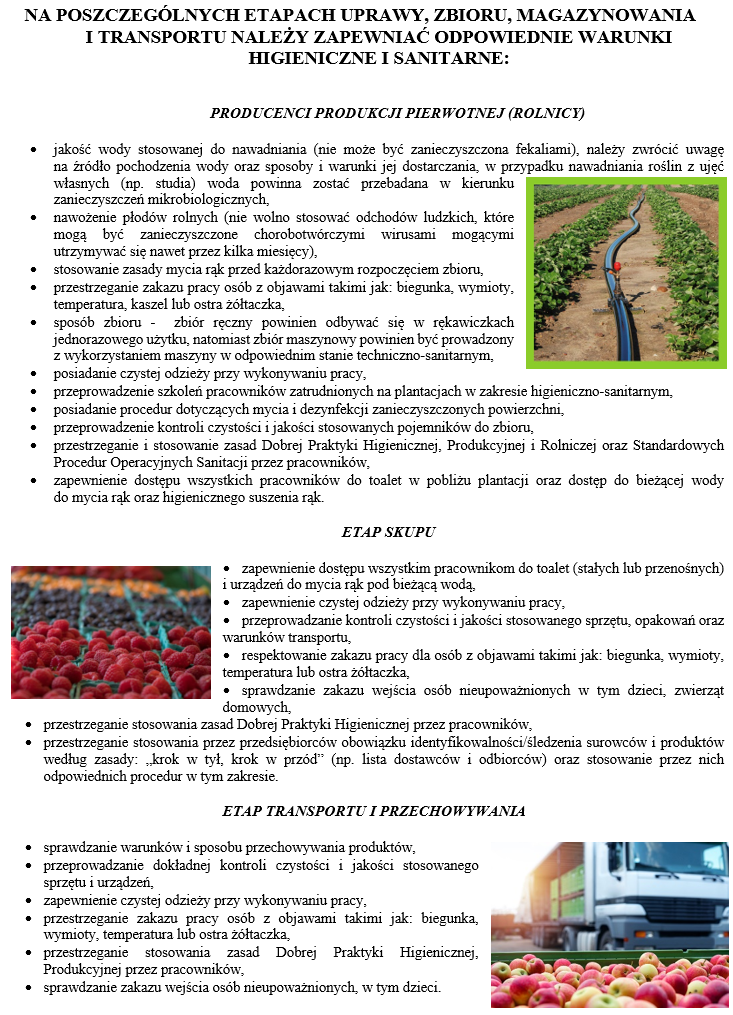 Więcej informacji dotyczących warunków higienicznych i sanitarnych uprawy, zbioru, magazynowania oraz transportu znajdą Państwo w ulotkach oraz "Zawiadomieniu Komisji