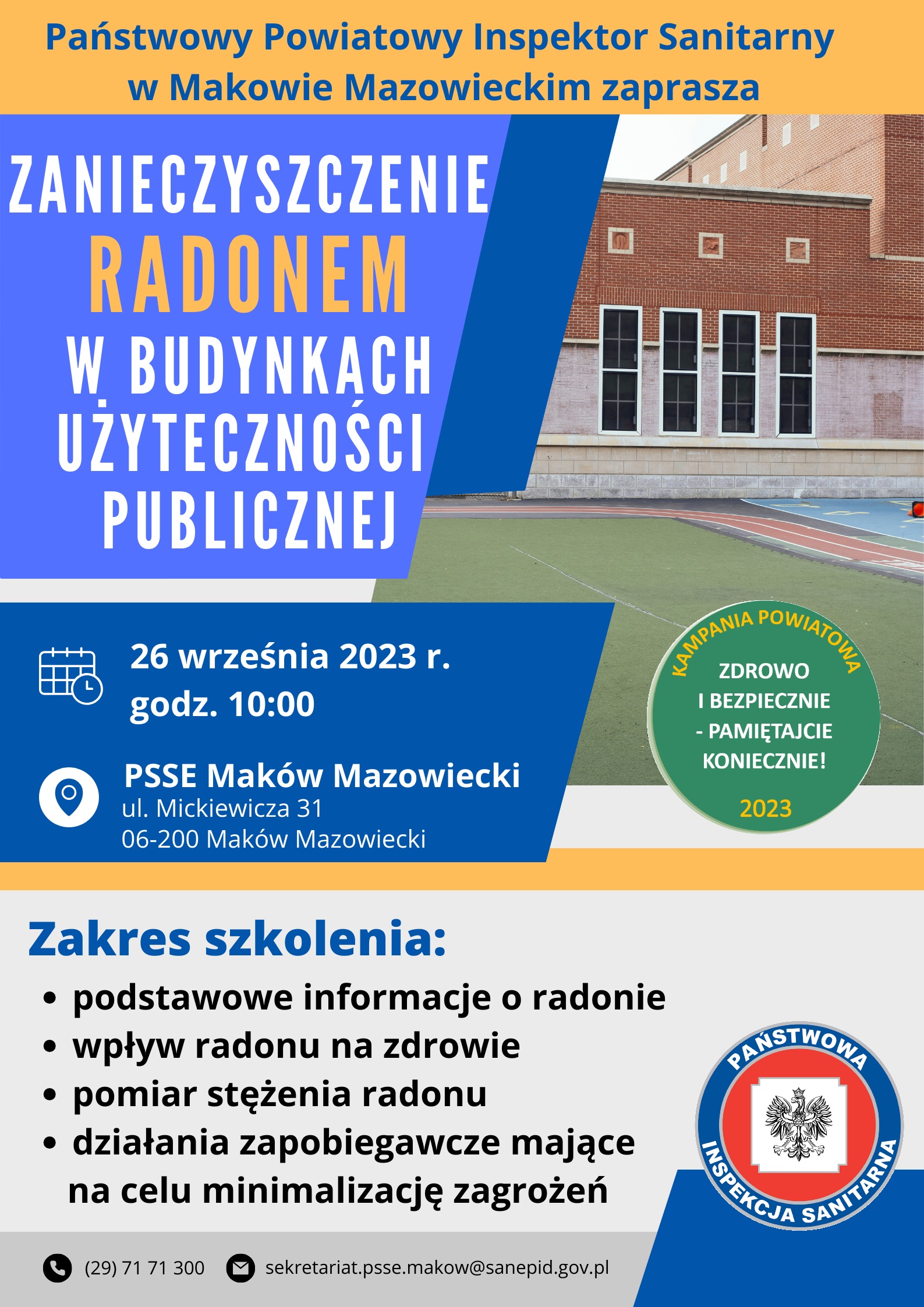 Państwowy Powiatowy Inspektor Sanitarny w Makowie Mazowieckim zaprasza przedstawicieli jednostek terytorialnych, dyrektorów placówek oświatowych, zarządców budynków użyteczności publicznej oraz budynków zamieszkania zbiorowego w ramach projektu edukacyjnego do udziału w szkoleniu na temat „Zanieczyszczenia radonem w budynkach użyteczności publicznej”, które odbędzie się w dniu 26 września 2023 r. o godz. 10:00 w sali konferencyjnej Powiatowej Stacji Sanitarno-Epidemiologicznej w Makowie Mazowieckim przy ul. Mickiewicza 31. Zgłoszenia kandydatów do udziału w szkoleniu proszę dokonać do dnia 19.09.2023 r. w oparciu o „Formularz zgłoszeniowy” - osobiście bądź na adres e-mail sekretariat.psse.makow@sanepid.gov.pl.