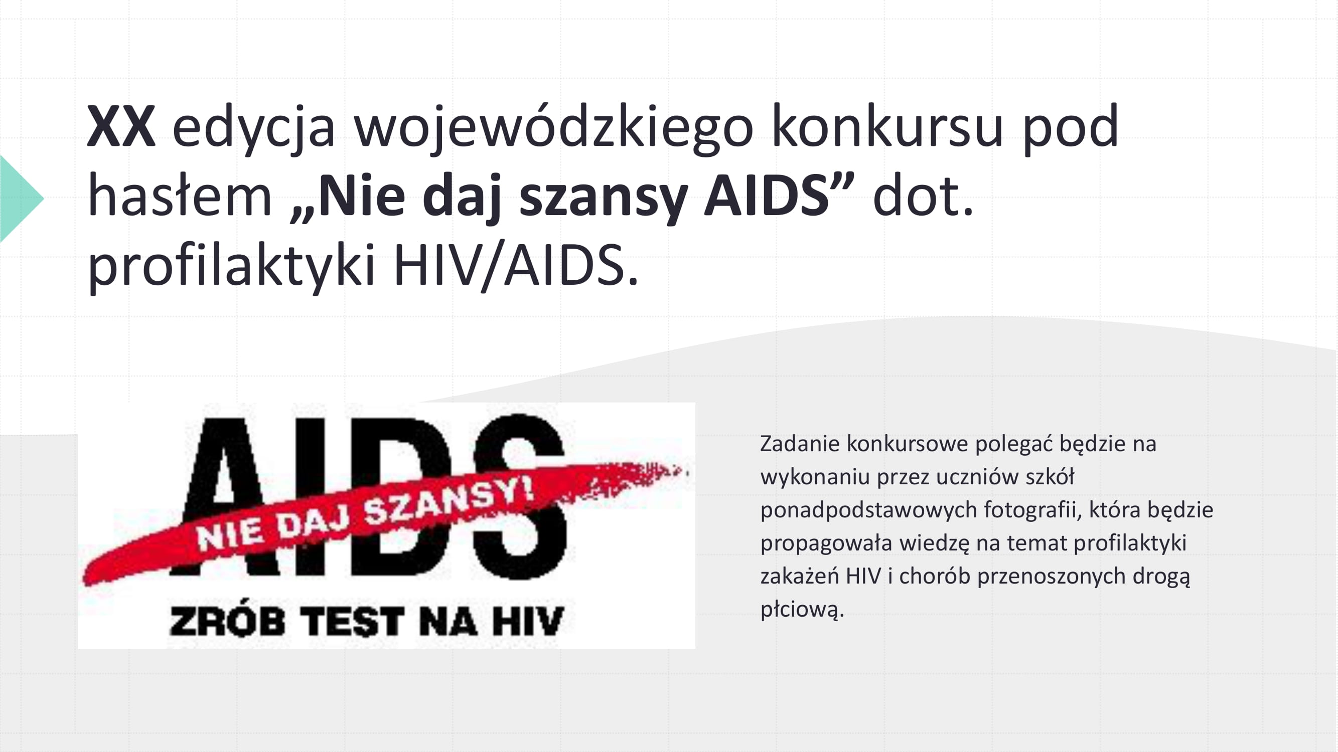 Państwowy Powiatowy Inspektor Sanitarny w Międzychodzie informuje, iż w roku szkolnym 2023/24 odbędzie się XXI edycja wojewódzkiego konkursu pod hasłem „Nie daj szansy AIDS” dot. profilaktyki HIV/AIDS.
