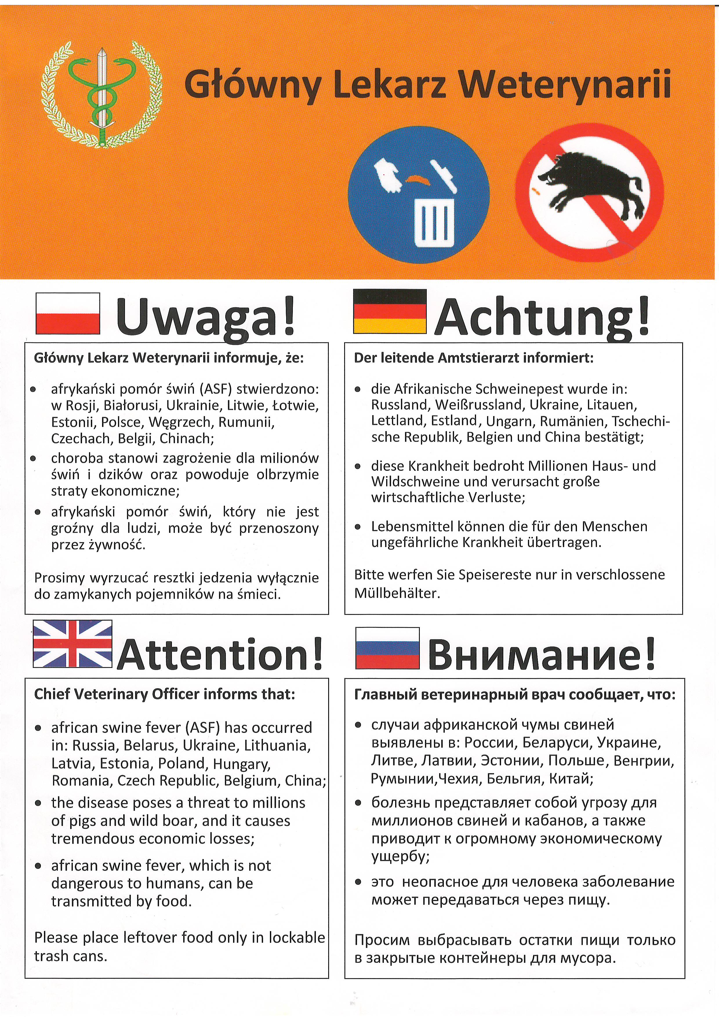 W załączeniu ulotki Głównego Lekarza Weterynarii dotyczące Afrykańskiego Pomoru Świń (ASF).