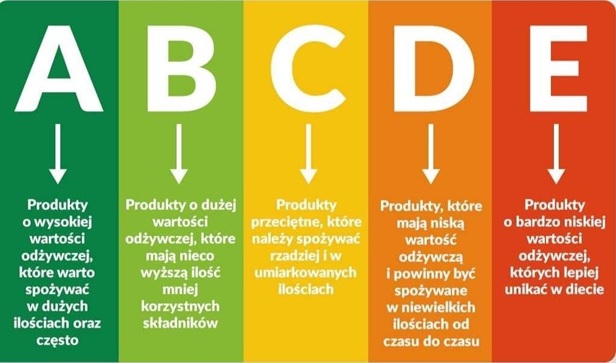 Taka klasyfikacja wskazuje, że produkty z zielonym oznaczeniem A lub B to te ważne w diecie, które warto włączyć do codziennego jadłospisu, ponieważ cechujące się wysoką wartością odżywczą. Natomiast oznaczenie pomarańczowe D oraz czerwone E sugeruje, że produkty te zawierają większą ilość składników, które powinno się ograniczać i należy je spożywać rzadziej lub w mniejszej ilości.
