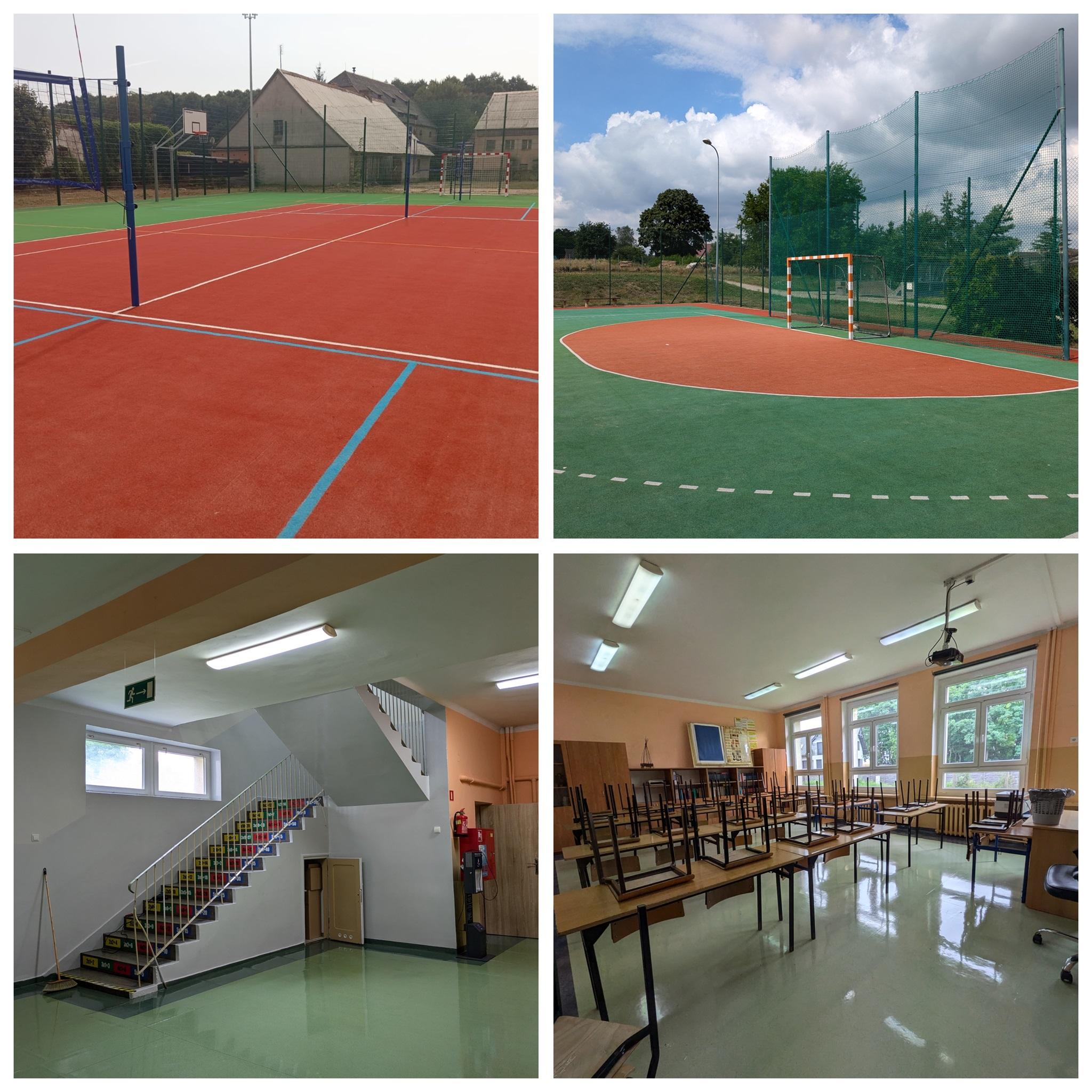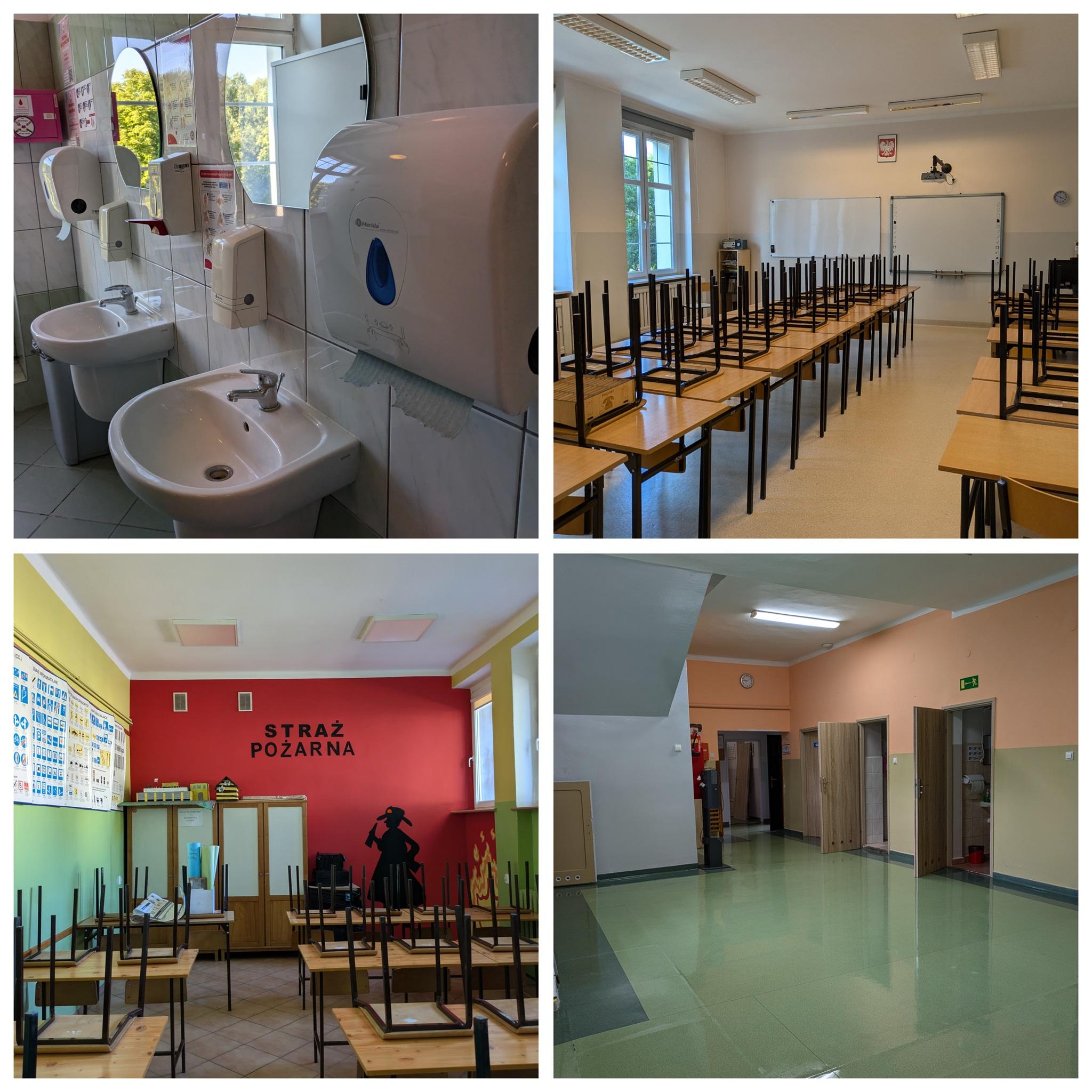 Podczas przerwy letniej do dnia kontroli (08.08.2024 r.) prowadzono na terenie placówki prace konserwatorsko-porządkowe polegające na wymienianie uszkodzonych lamp i świetlówek, uzupełnianiu ubytków w powłokach ściennych, gruntownym myciu: okien, podłóg, ścian i innych elementów wyposażenia szkoły, koszeniu trawy, dbaniu o zieleń wokół budynku szkoły. Ponadto w pomieszczeniu w zagłębiu w świetlicy zamontowano wentylację mechaniczną, a także zakupiono pochłaniacz wilgoci. Szkoła wyposażona w dyspenser z płynem do dezynfekcji rąk.