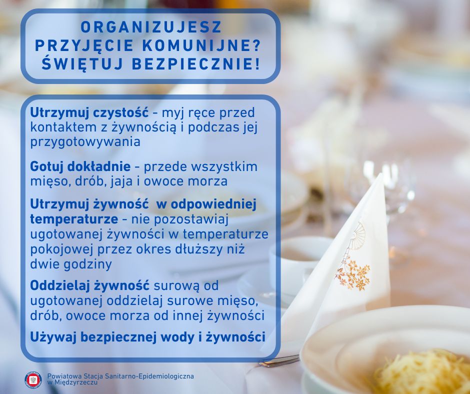 Trwa okres uroczystości komunijnych. Podczas przygotowywania poczęstunku należy pamiętać o pewnych zasadach, które pozwolą nam uniknąć zatruć pokarmowych. Zakażenia pokarmowe mogą być szczególnie niebezpieczne dla niemowląt, małych dzieci, osób z upośledzoną odpornością oraz osób starszych.