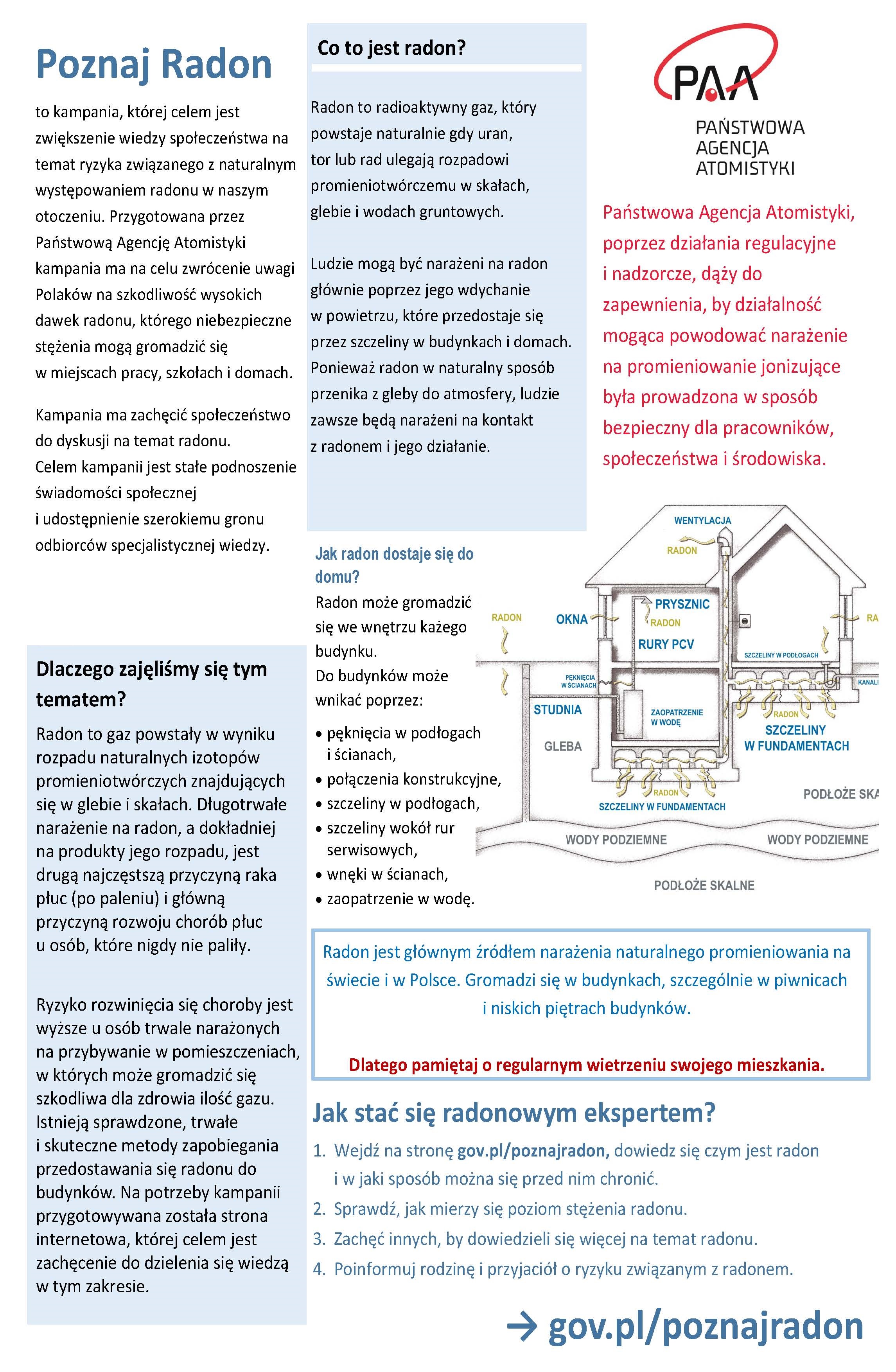 Radon jest gazem promieniotwórczym powszechnie występującym naturalnie w środowisku: w podłożu gruntowym, wodzie i powietrzu. Powstaje w wyniku promieniotwórczego rozpadu radu, który z kolei tworzy się w wyniku rozpadu uranu. Jako gaz może łatwo się przemieszczać. O ile w otwartej przestrzeni jego stężenie jest bardzo małe, w zamkniętych, źle wietrzonych pomieszczeniach, do których przedostaje się z podłoża gruntowego, jego poziom rośnie, co może prowadzić do negatywnych skutków zdrowotnych. Ryzyko narażenia na radon może wystąpić m.in. w miejscu zamieszkania, miejscu pracy oraz w budynkach o mieszanym przeznaczeniu.