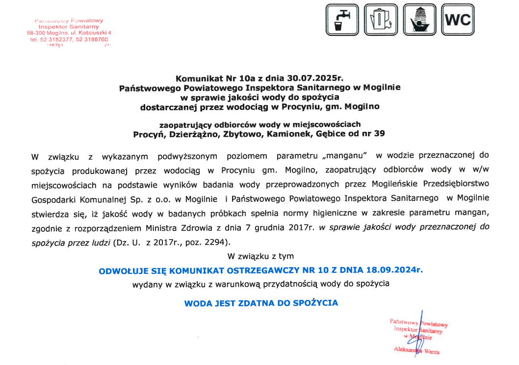 Komunikat nr 10 a PPIS w Mogilnie w sprawie jakości wody do spożycia dostarczanej przez wodociąg w Procyniu 31.07.2025 Materiały Komunikat nr 10a wodociąg Procyń Zrzut_ekranu_2025-07-31_103001.png 0.22MB