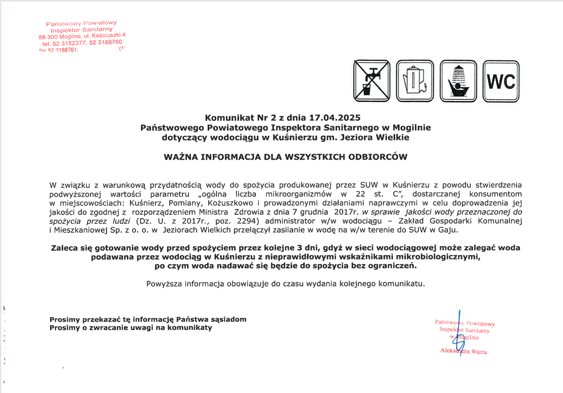 Komunikat nr 2 PPIS w Mogilnie o warunkowej przydatności wody do spożycia przez ludzi dostarczanej przez wodociąg publiczny w Kuśnierzu