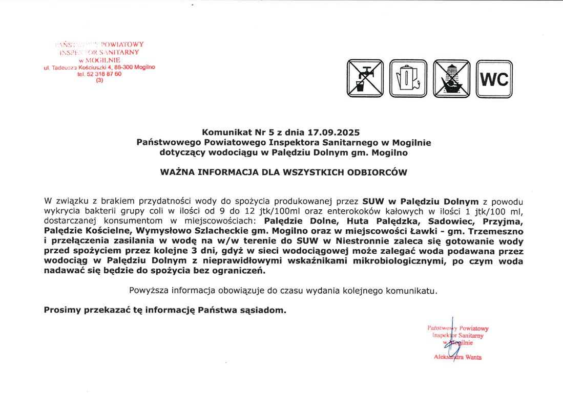 Komunikat nr 5 PPIS w Mogilnie o wprowadzeniu nakazu przegotowania wody do spożycia dostarczanej przez wodociąg publiczny w Palędziu Dolnym.