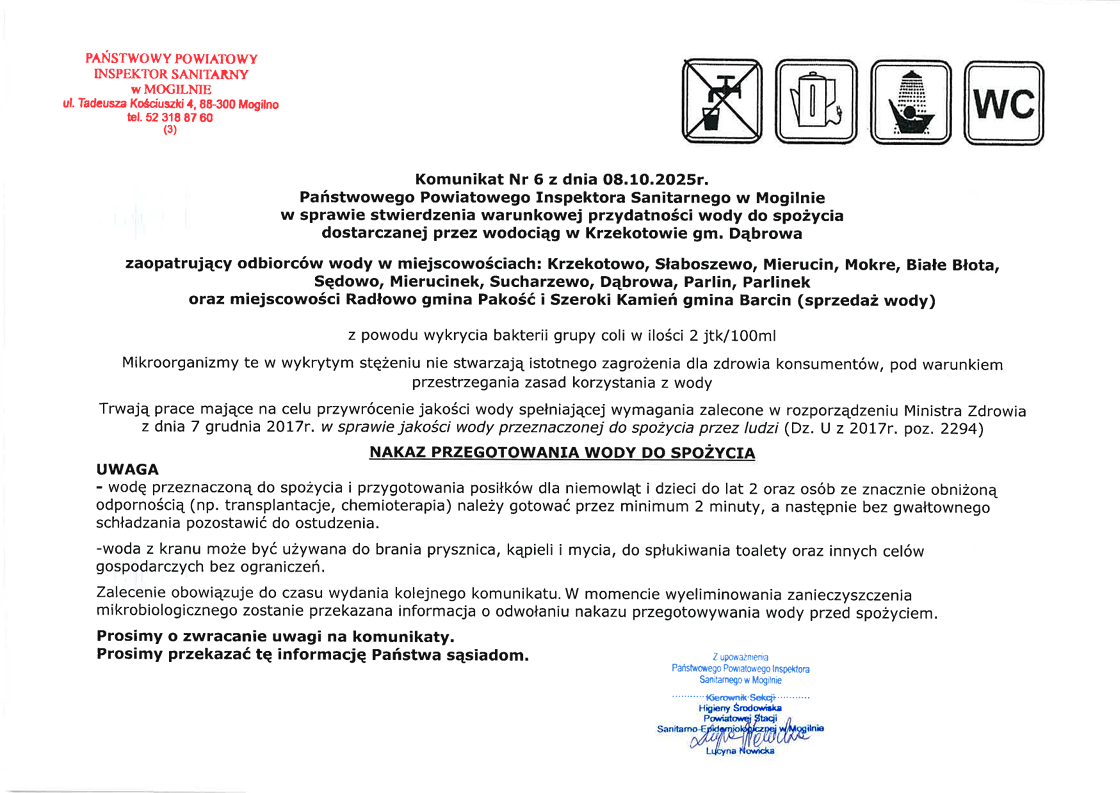 Komunikat nr 6 PPIS w Mogilnie o wprowadzeniu nakazu przegotowania wody do spożycia dostarczanej przez wodociąg publiczny w Krzekatowie.