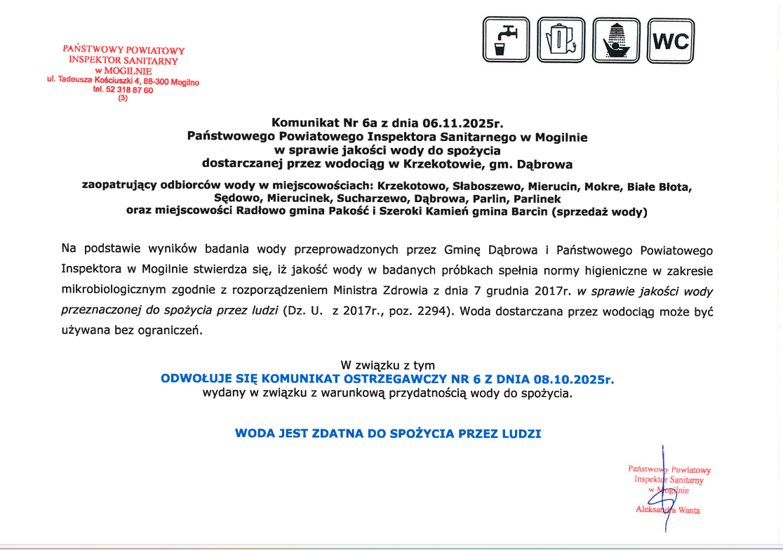 Komunikat nr 6a PPIS w Mogilnie w sprawie jakości wody do spożycia dostarczanej przez wodociąg publiczny w Krzekatowie. 06.11.2025 Materiały Komunikat 6a wodociąg Krzekatowo Komunikat_6a.png 0.26MB
