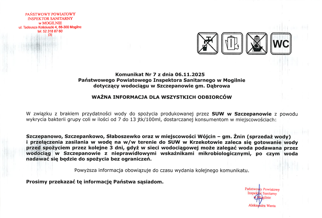 Komunikat nr 7 PPIS w Mogilnie o warunkowej przydatności wody do spożycia przez ludzi dostarczanej przez wodociąg publiczny w Szczepanowie 06.11.2025 Materiały Komunikat nr 7 Komunikat_nr_7.png 0.29MB