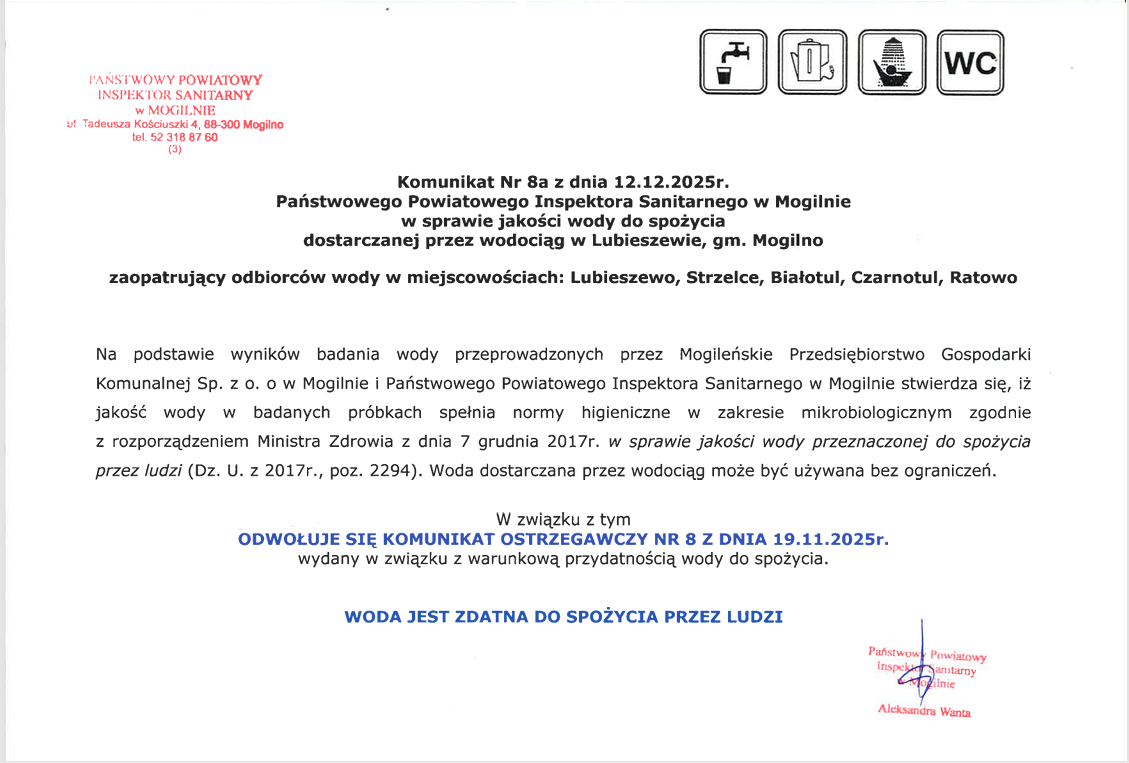 Komunikat nr 8a PPIS w Mogilnie w sprawie jakości wody do spożycia przez ludzi dostarczanej przez wodociąg publiczny w Lubieszewie