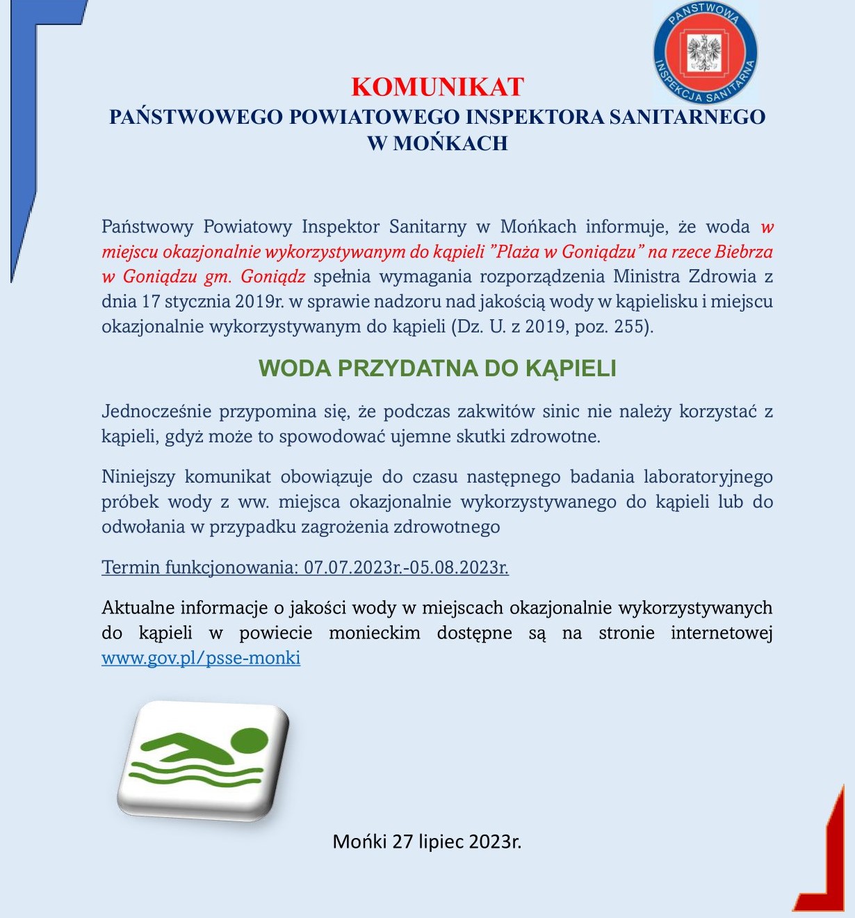 Państwowy Powiatowy Inspektor Sanitarny w Mońkach informuje, że woda w miejscu okazjonalnie wykorzystywanym do kąpieli ”Plaża w Goniądzu” na rzece Biebrza w Goniądzu gm. Goniądz spełnia wymagania rozporządzenia Ministra Zdrowia z dnia 17 stycznia 2019r. w sprawie nadzoru nad jakością wody w kąpielisku i miejscu okazjonalnie wykorzystywanym do kąpieli (Dz. U. z 2019, poz. 255).