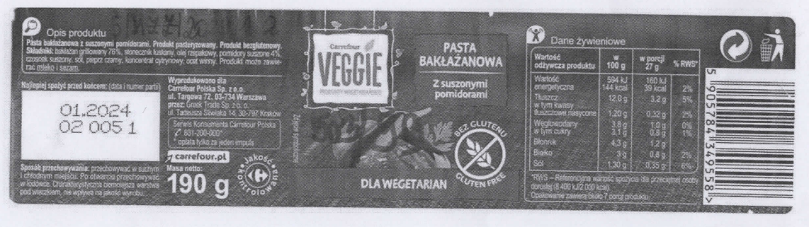 Ostrzeżenie publiczne dotyczące żywności: Wykrycie niezadeklarowanej substancji alergennej – dwutlenku siarki w określonej partii produktu pn. Pasta bakłażanowa z suszonymi pomidorami