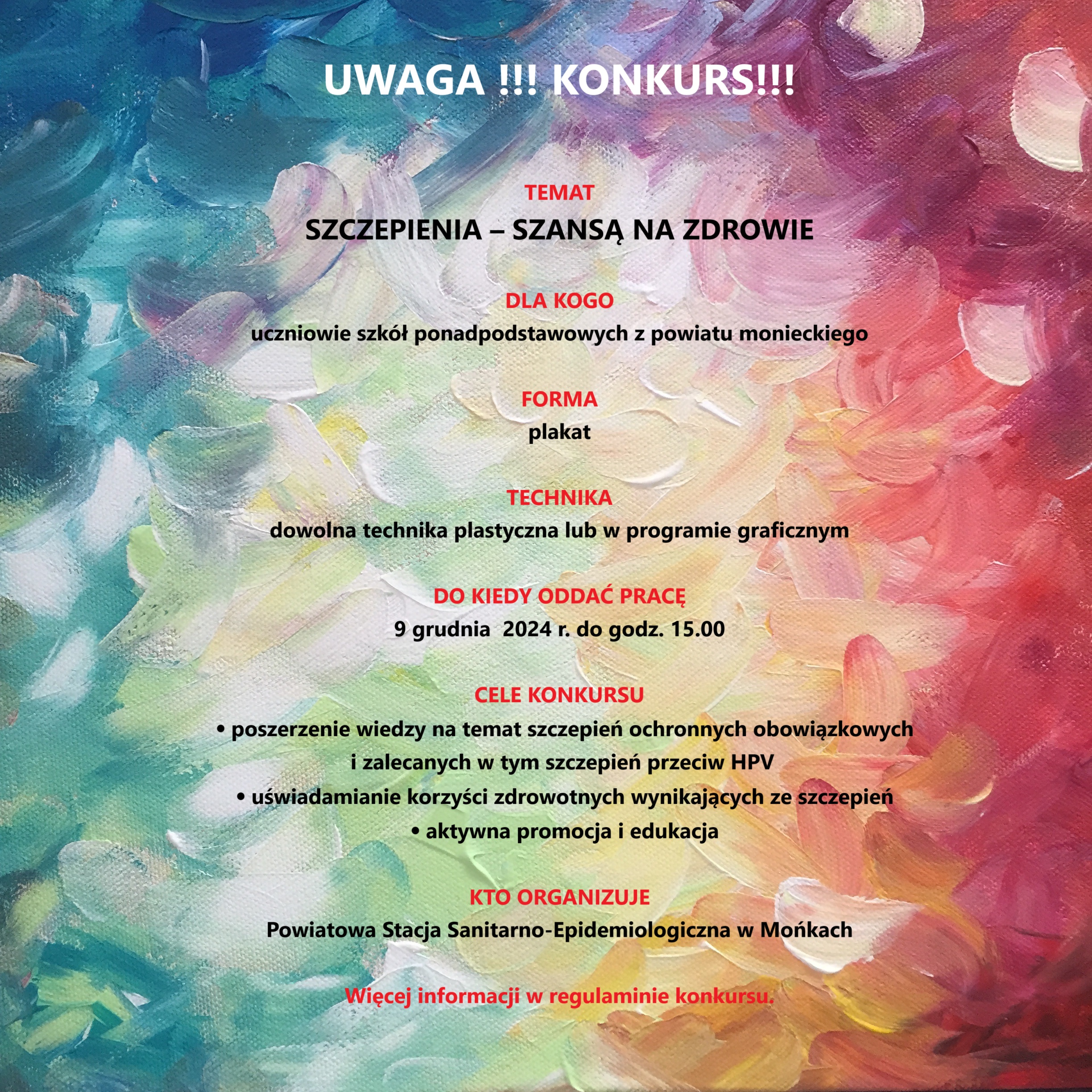Państwowy Powiatowy Inspektor Sanitarny w Mońkach serdecznie zaprasza do udziału w konkursie na plakat „SZCZEPIENIA – SZANSĄ NA ZDROWIE”.
