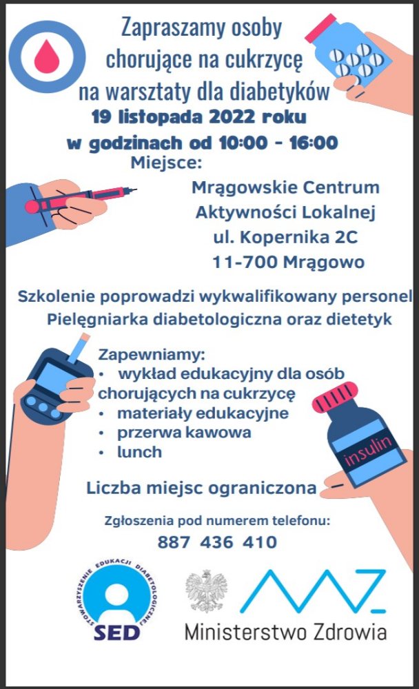 Stowarzyszenie Edukacji Diabetoligicznej oraz Ministerstwo Zdrowia oraganizuje warsztaty dla diabetyków w Mrągowie.