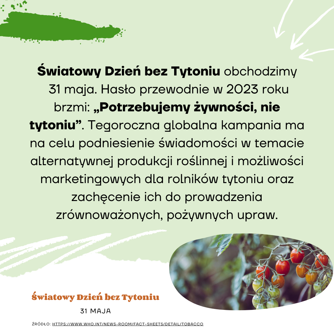 31 maja, obchodzimy na całym świecie DZIEŃ BEZ TYTONIU - „Uprawiaj żywność, nie tytoń” („Grow food, not tobacco”) tak brzmi tegoroczne hasło Światowego Dnia bez Tytoniu 2023.