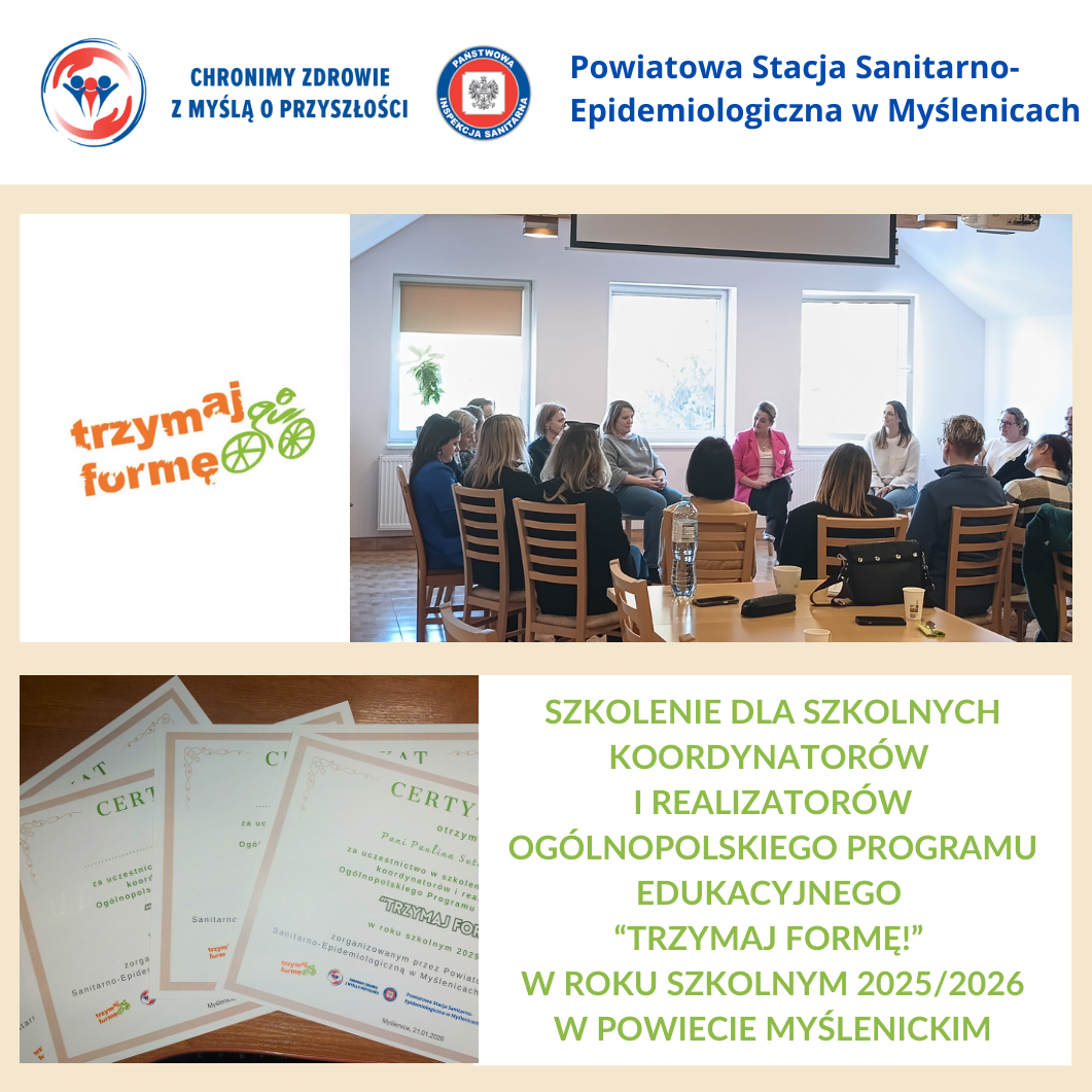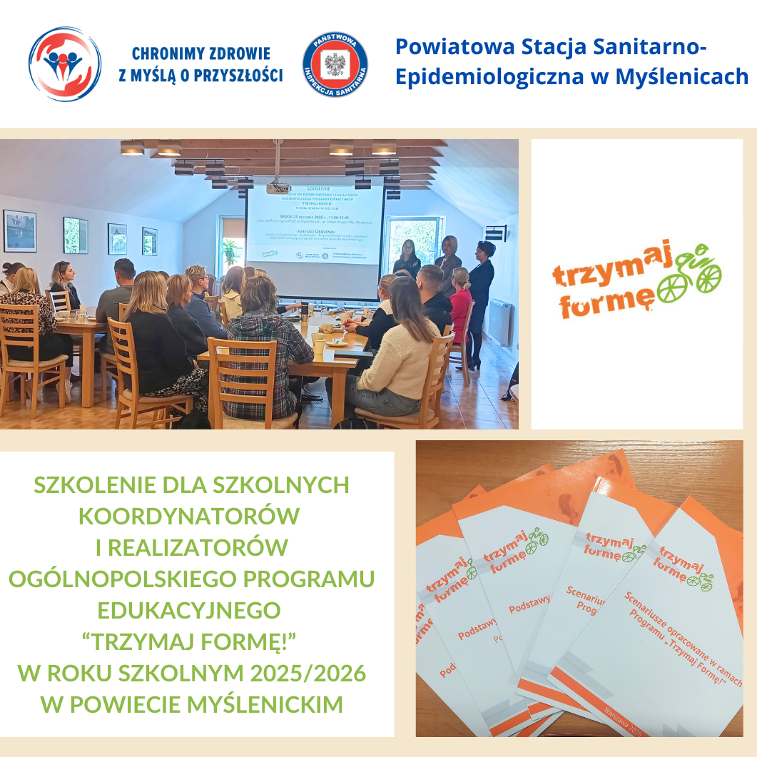 W dniu 21.01.2026 w siedzibie PSSE w Myślenicach odbyło się SZKOLENIE DLA SZKOLNYCH KOORDYNATORÓW I REALIZATORÓW OGÓLNOPOLSKIEGO PROGRAMU EDUKACYJNEGO “TRZYMAJ FORMĘ!” W ROKU SZKOLNYM 2025/2026 W POWIECIE MYŚLENICKIM