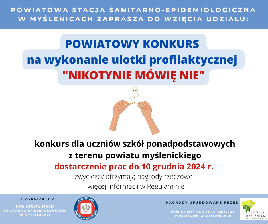 Powiatowa Stacja Sanitarno-Epidemiologiczna w Myślenicach organizuje Powiatowy konkurs na wykonanie ulotki profilaktycznej "Nikotynie mówię NIE". Adresatami konkursu są uczniowie wszystkich klas szkół ponadpodstawowych z terenu powiatu myślenickiego.