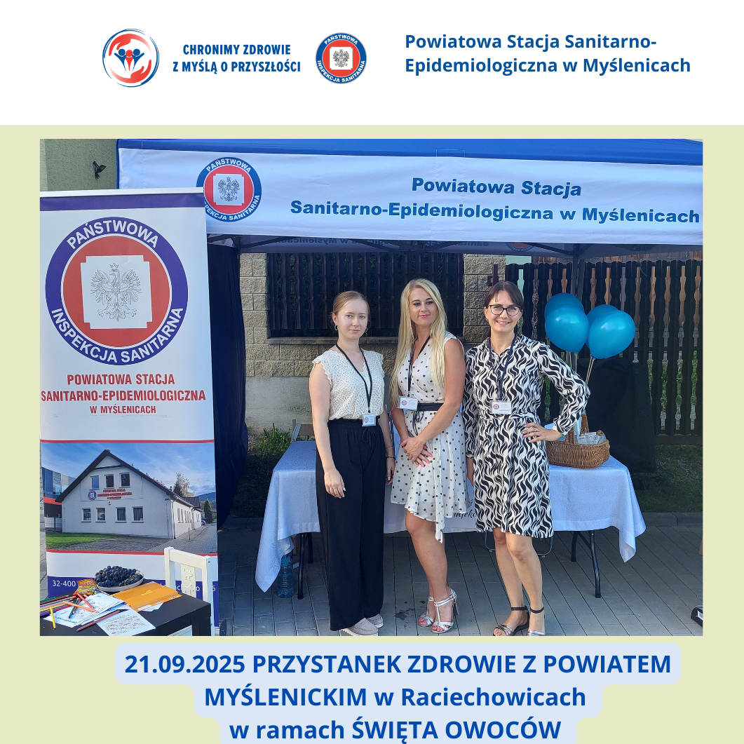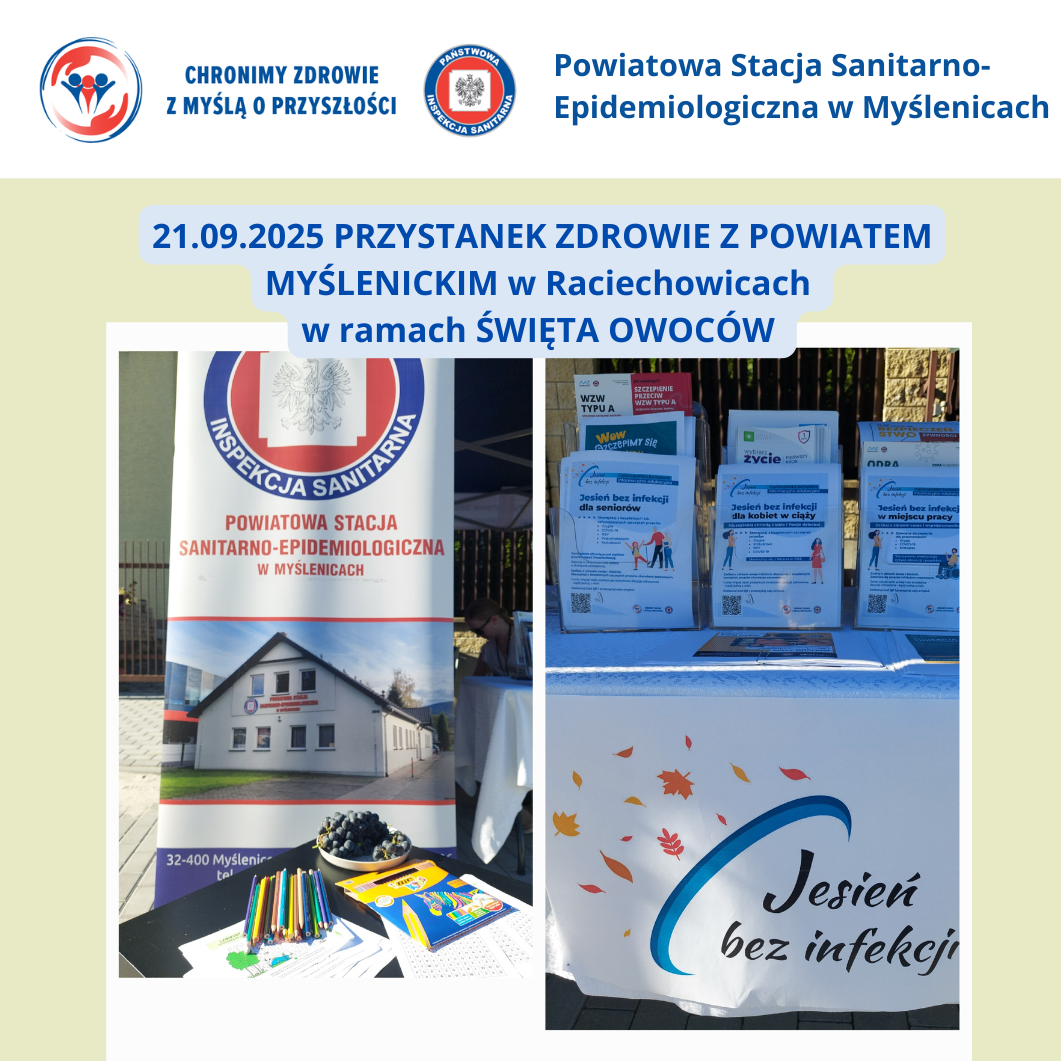 21.09.2025 odbył się kolejny PRZYSTANEK ZDROWIE Z POWIATEM MYŚLENICKIM, ktorego organizatorem było Starostwo Powiatowe w Myślenicach. Przystanek Zdrowie było częścią więszego wydarzenia - Święta Owoców w Gminie Raciechowice organizowanego przez Gminny Ośrodek Kultury i Sportu w Rachichowicach oraz Gminę Rachiechowice. Gratulujemy organizacji wspaniałego wydarzenia! Dla uczestników pikniku czekało stoisko edukacyjne przygotowane przez pracownikówm PSSE w Myślenicach z ulotkami na temat: bezpiecznej jesieni ("kampania "Jesień Bez Infekcji", bezpieczne grzybobranie, sposoby zabezpieczenia się przed kleszczami, czym jest borelioza), profilaktyki chorób zakaźnych, w tym szczepień ochronnych, ze szczególnym uwzględnieniem szczepień sezonowych seniorów, młodzieży, edukacji na temat bezpiecznej żywności, przechowywania, suplementów diety, materiały o nowym przedmiocie szkolnym "Edukacja zdrowotna", edukacja na temat HIV/AIDS, HPV, WZW.
