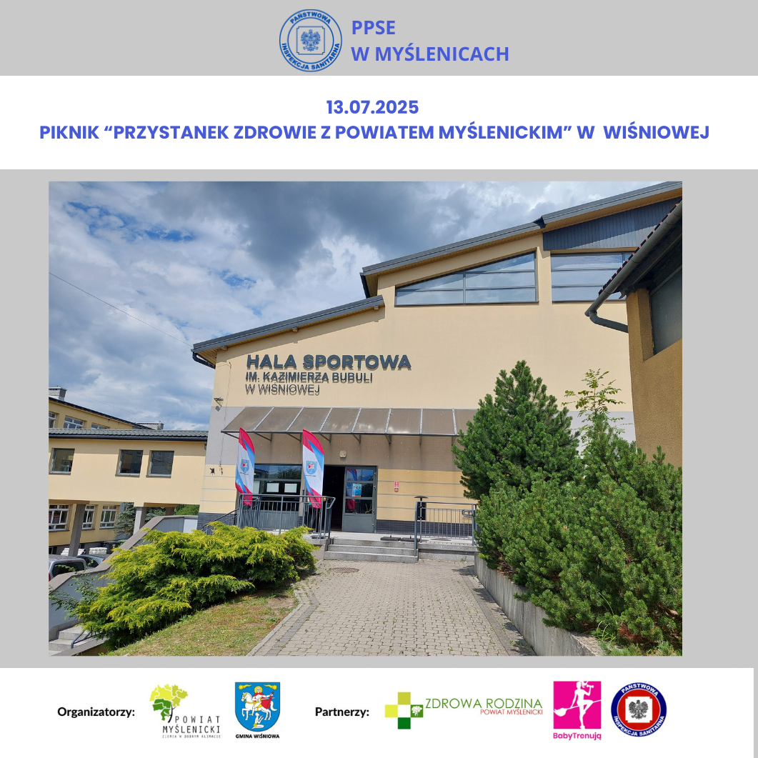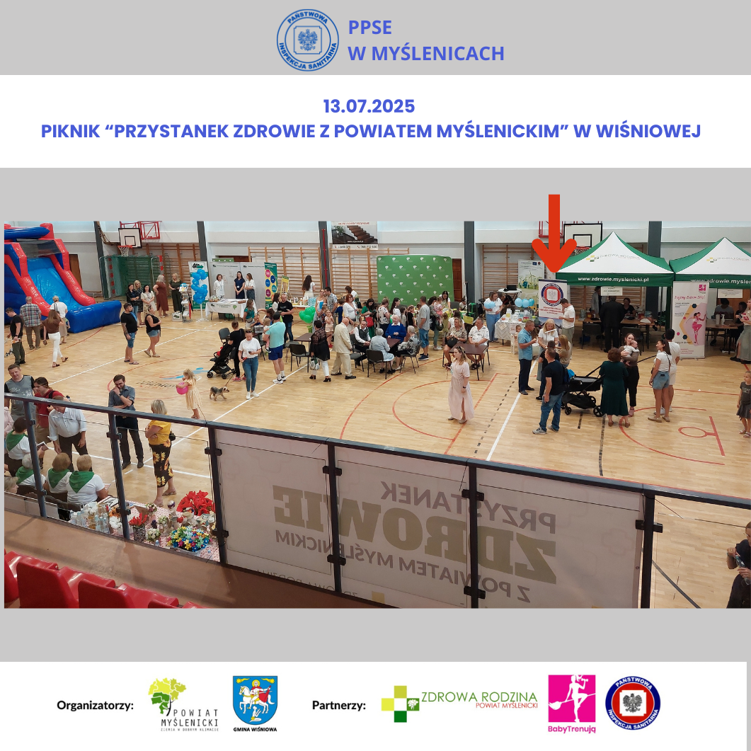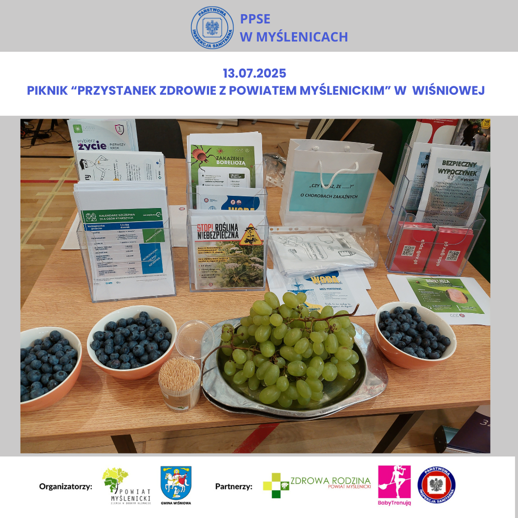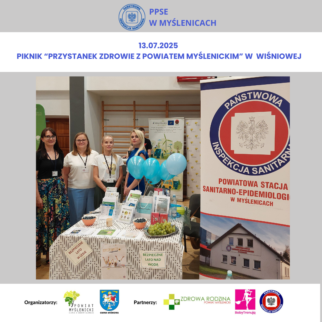 W niedzielę 13. lipca 2025 r. pracownicy Powiatowej Stacji Sanitarno-Epidemiologicznej w Myślenicach uczestniczyli w PRZYSTANKU ZDROWIE Z POWIATEM MYŚLENICKIM w Wiśniowej. Wydarzenie było zorganizowane przez Starostwo Powiatowe w Myślenicach - Powiat Myślenicki oraz Gminę Wiśniowa.