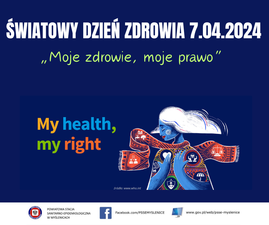 „Na całym świecie prawo milionów ludzi do zdrowia jest coraz bardziej zagrożone. Choroby i katastrofy są głównymi przyczynami śmierci i niepełnosprawności. Konflikty niszczą życie, powodując śmierć, ból, głód i cierpienie psychiczne. Spalanie paliw kopalnych powoduje jednocześnie kryzys klimatyczny i odbiera nam prawo do oddychania czystym powietrzem, a zanieczyszczenie powietrza w pomieszczeniach i na zewnątrz zabija życie co 5 sekund. Rada WHO ds. Ekonomiki Zdrowia dla Wszystkich ustaliła, że co najmniej 140 krajów uznaje w swoich konstytucjach zdrowie za prawo człowieka. Jednak kraje nie uchwalają i nie wdrażają w praktyce przepisów zapewniających swoim obywatelom prawo dostępu do usług zdrowotnych. Potwierdza to fakt, że w 2021 r. co najmniej 4,5 miliarda ludzi – ponad połowa światowej populacji – nie było w pełni objętych podstawowymi usługami zdrowotnymi. Aby stawić czoła tego typu wyzwaniom, Światowy Dzień Zdrowia w 2024 r. brzmi: „Moje zdrowie, moje prawo”. Tegoroczny temat został wybrany tak, aby bronić prawa każdego i wszędzie do dostępu do wysokiej jakości usług zdrowotnych, edukacji i informacji, a także bezpiecznej wody pitnej, czystego powietrza, dobrego odżywiania, wysokiej jakości mieszkań, godnych warunków pracy i środowiska oraz wolności od dyskryminacji” (tłum. z jęz. ang., tekst źródłowy: https://www.who.int/campaigns/world-health-day/2024)
