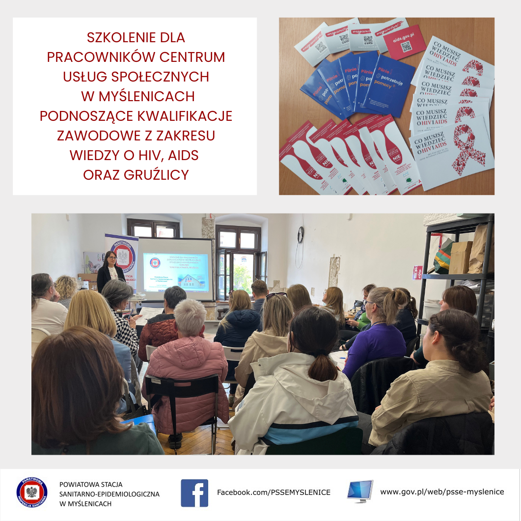 13.05.2025 na zaproszenie Centrum Usług Społecznych w Myślenicach w Myślenicach Pani Joanna Gaździk, pracownik Oświaty Zdrowotnej i Promocji Zdrowia Powiatowej Stacji Sanitarno-Epidemiologicznej w Myślenicach poprowadziła szkolenie dla 22 pracowników zatrudnionych w Centrum Usług Społecznych w Myślenicach podnoszące ich kwalifikacje zawodowe z zakresu wiedzy o: HIV, AIDS oraz gruźlicy.