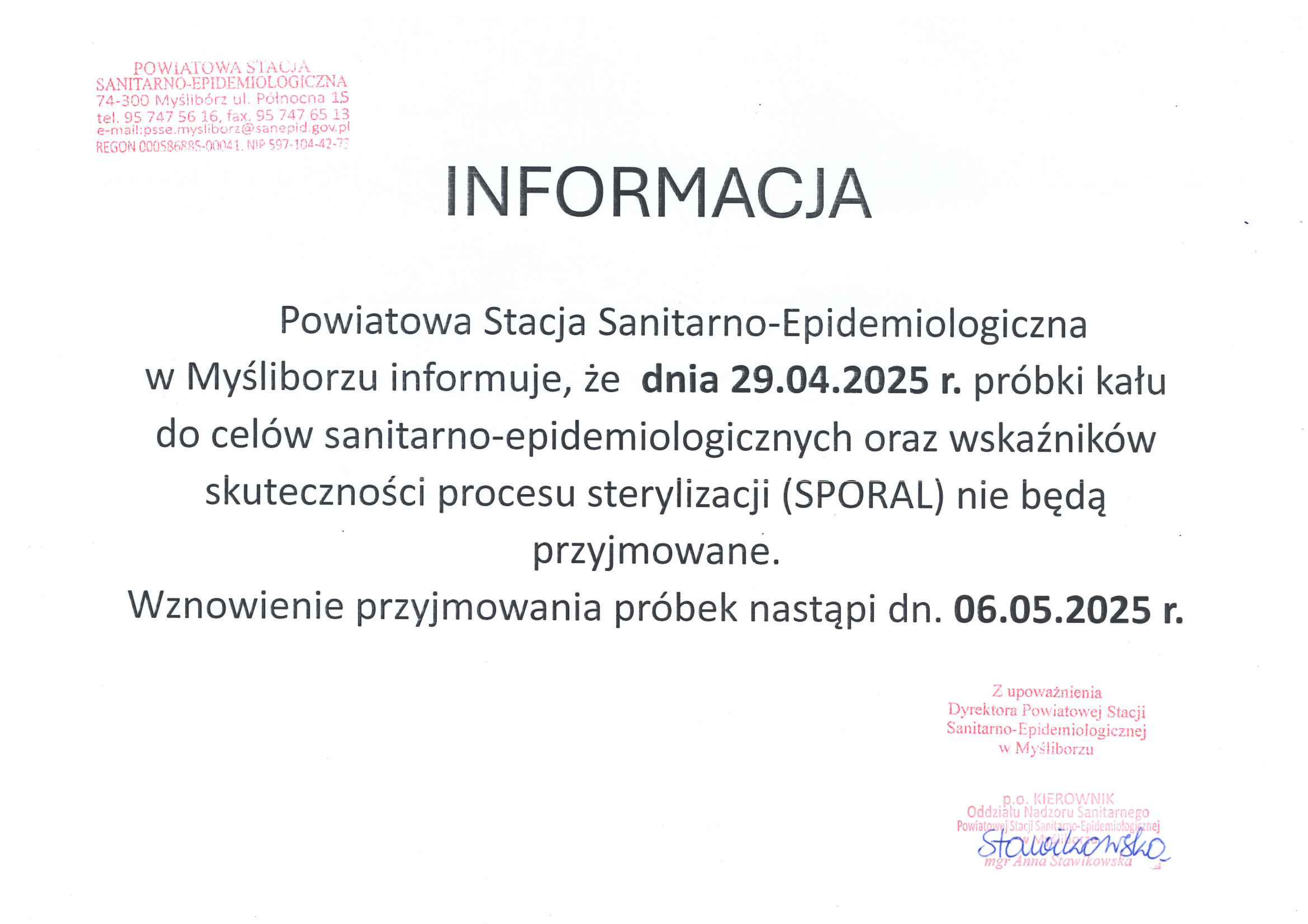 Powiatowa Stacja Sanitarno-Epidemiologiczna w Myśliborzu informuje, że dnia 29.04.2025 r. próbki kału do celów sanitarno-epidemiologicznych oraz wskaźników skuteczności procesu sterylizacji (SPORAL) nie będą przyjmowane.