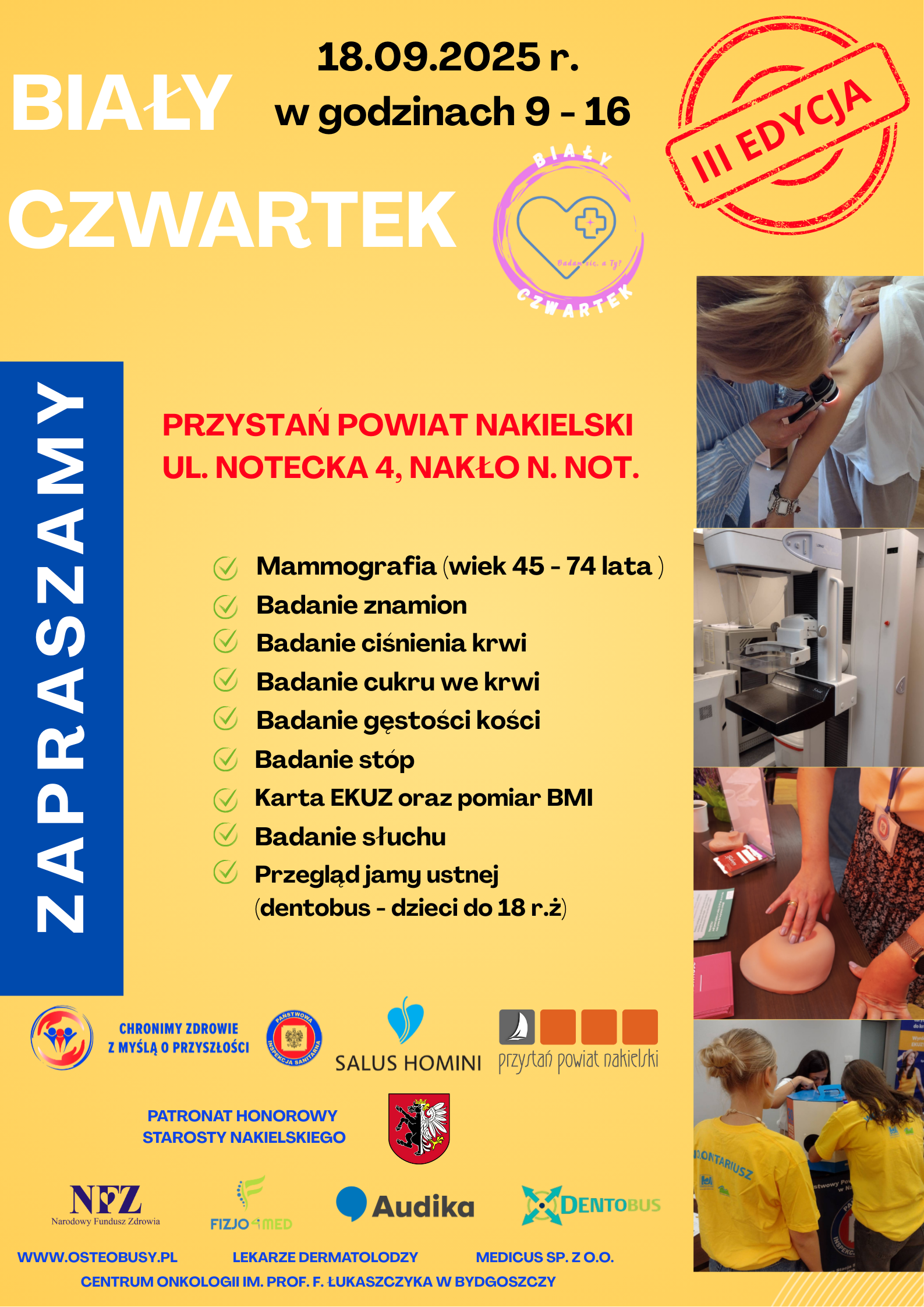 18 września 2025 roku odbędzie się III edycja akcji profilaktycznej "Biały Czwartek" organizowana przez Państwowego Powiatowego Inspektora Sanitarnego w Nakle nad Notecią oraz Fundację "Salus Homini" pod honorowym patronatem Starosty Nakielskiego.
