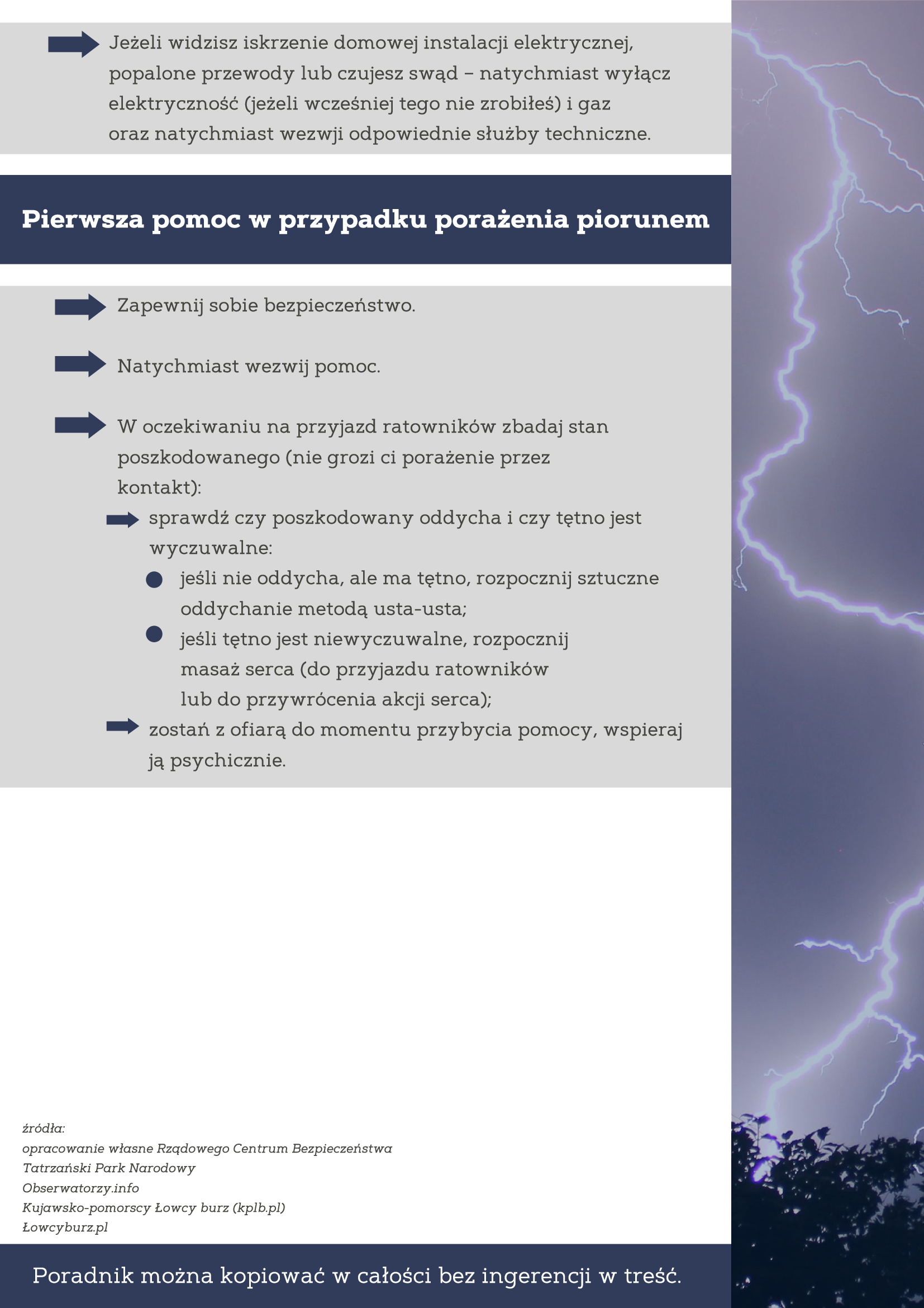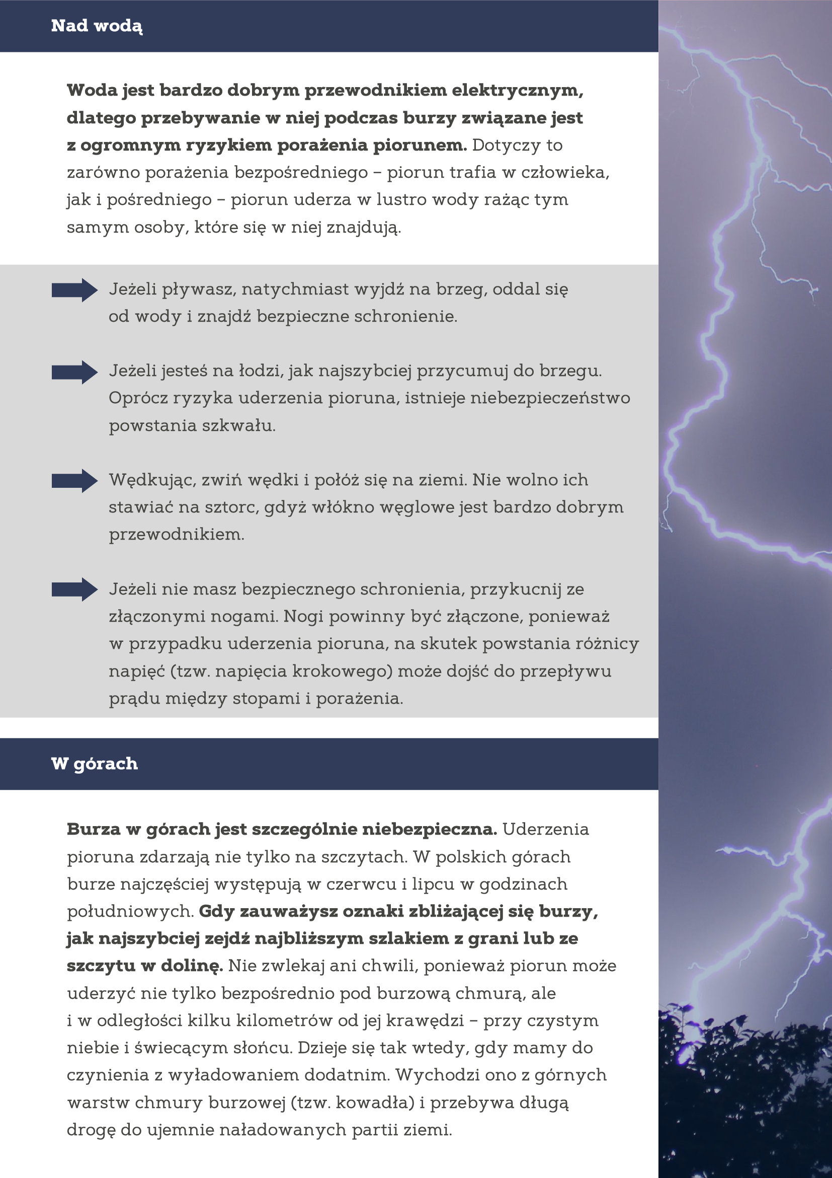 M.in. należy jak najszybciej znaleźć schronienie. Unikaj przebywania na otwartej przestrzeni i pod drzewami. Jeśli nie masz możliwości schronienia na otwartej przestrzeni, poszukaj obniżenia terenu. Kucnij ze złączonymi i podciągniętymi pod siebie nogami! Unikaj dotykania przedmiotów zrobionych z metalu. Jeśli jedziesz samochodem – nie wysiadaj z niego. Samochód to dobra ochrona przed uderzeniem pioruna.