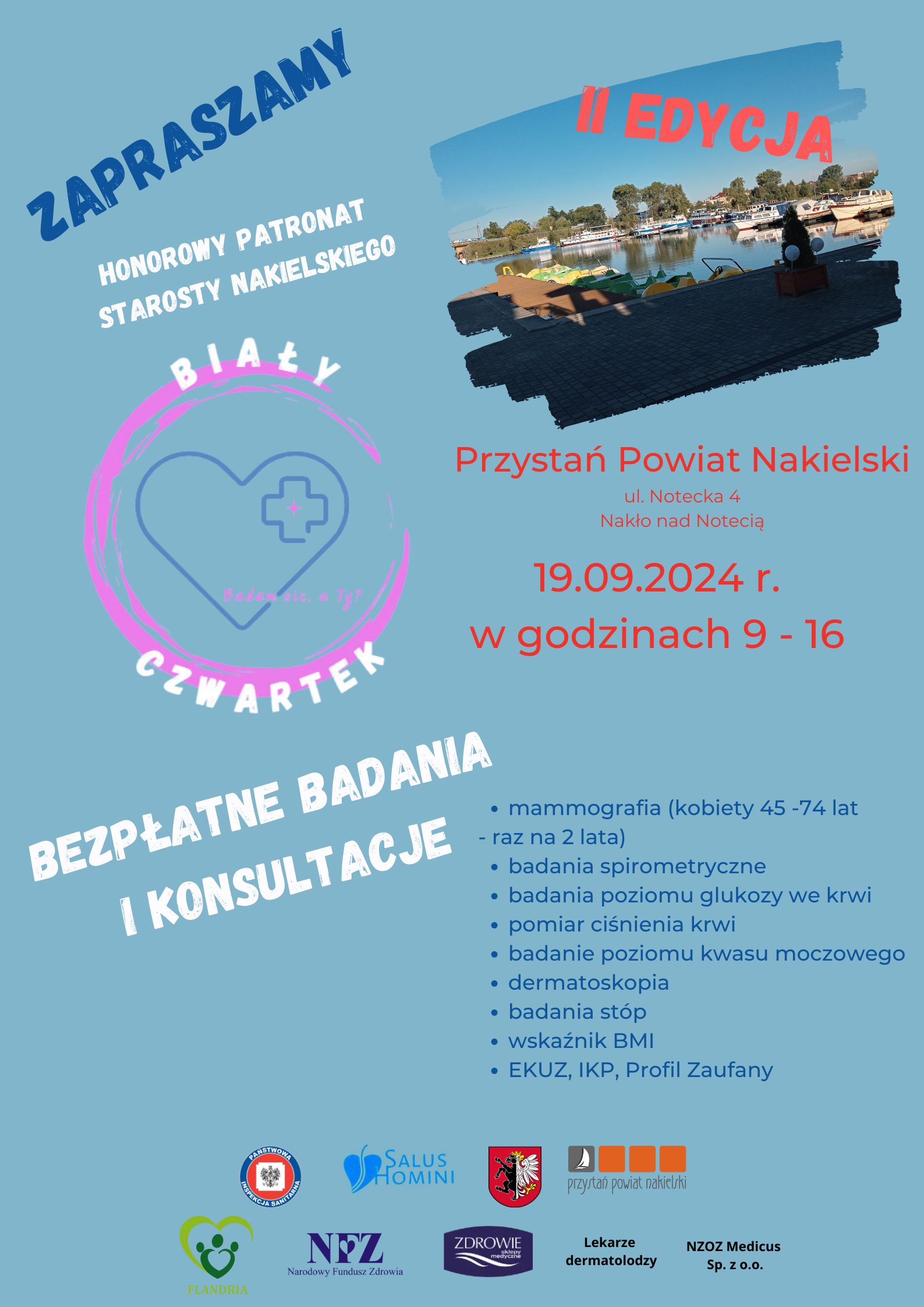 W dniu 19.09.2024 r. (czwartek) w godzinach od 9:00 do 16:00 serdecznie zapraszamy do odwiedzenia Przystani Powiat Nakielski ul. Notecka 4 w Nakle nad Notecią. Będziecie mogli skorzystać z bezpłatnych badań i konsultacji.