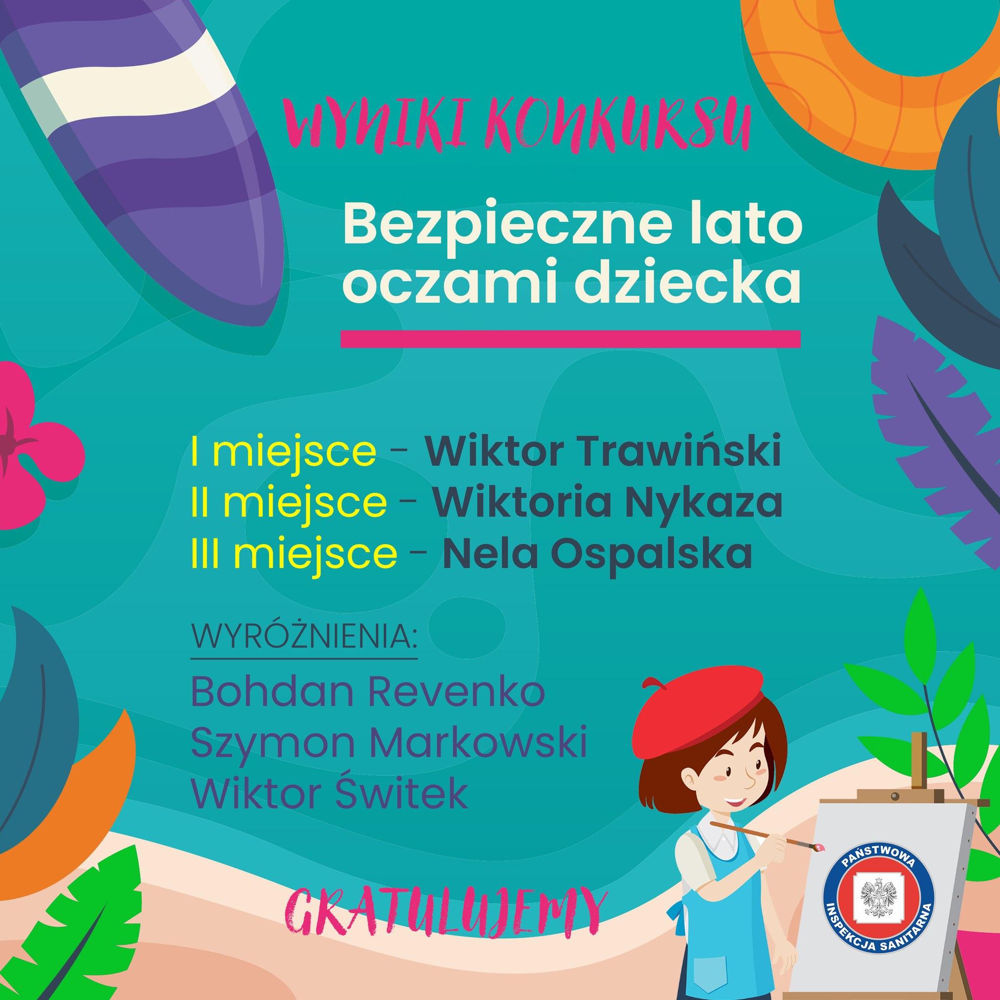 Wojewódzka Stacja Sanitarno - Epidemiologiczna w Bydgoszczy ogłosiła 14 czerwca wyniki konkursu plastycznego pn. Bezpieczne lato oczami dziecka, który był kierowany dla uczniów klas I-III szkół podstawowych, na terenie województwa Kujawsko - Pomorskiego.