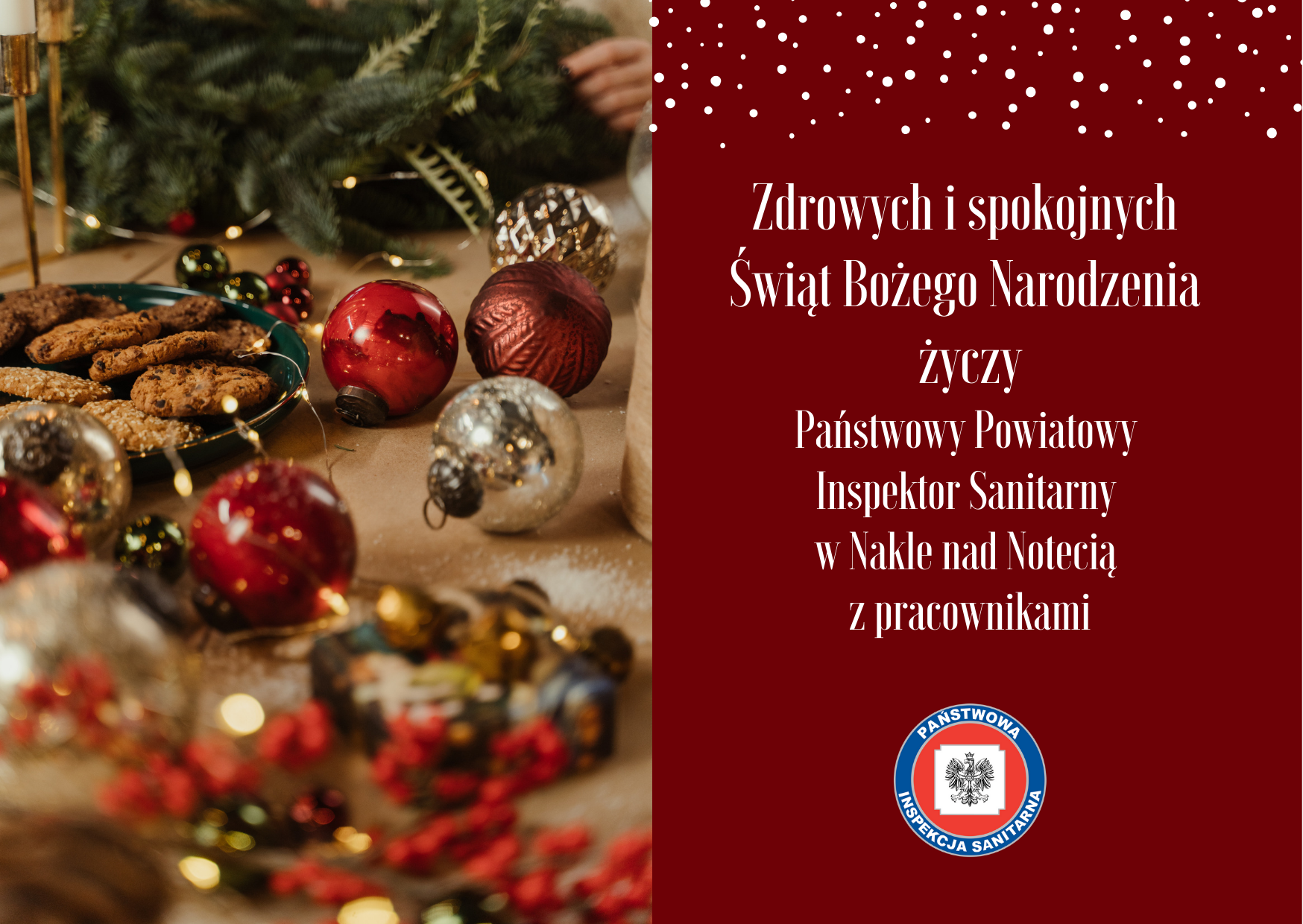 Państwowy Powiatowy Inspektor Sanitarny w Nakle nad Notecią oraz pracownicy Powiatowej Stacji Sanitarno - Epidemiologicznej w Nakle nad Notecią z okazji zbliżających się Świąt Bożego Narodzenia składają najserdeczniejsze życzenia, wszelkiej pomyślności, radości oraz zdrowia. Niech te święta będą czasem spokoju oraz odpoczynku od dnia codziennego.
