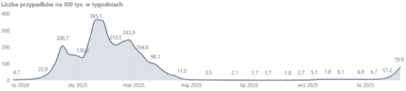 listopada 2025, obserwuje się utrwalony trend wzrostowy zachorowań na grypę, sięgający obecnie 80 przypadków na 100tys mieszkańców, z największą zachorowalnością na
