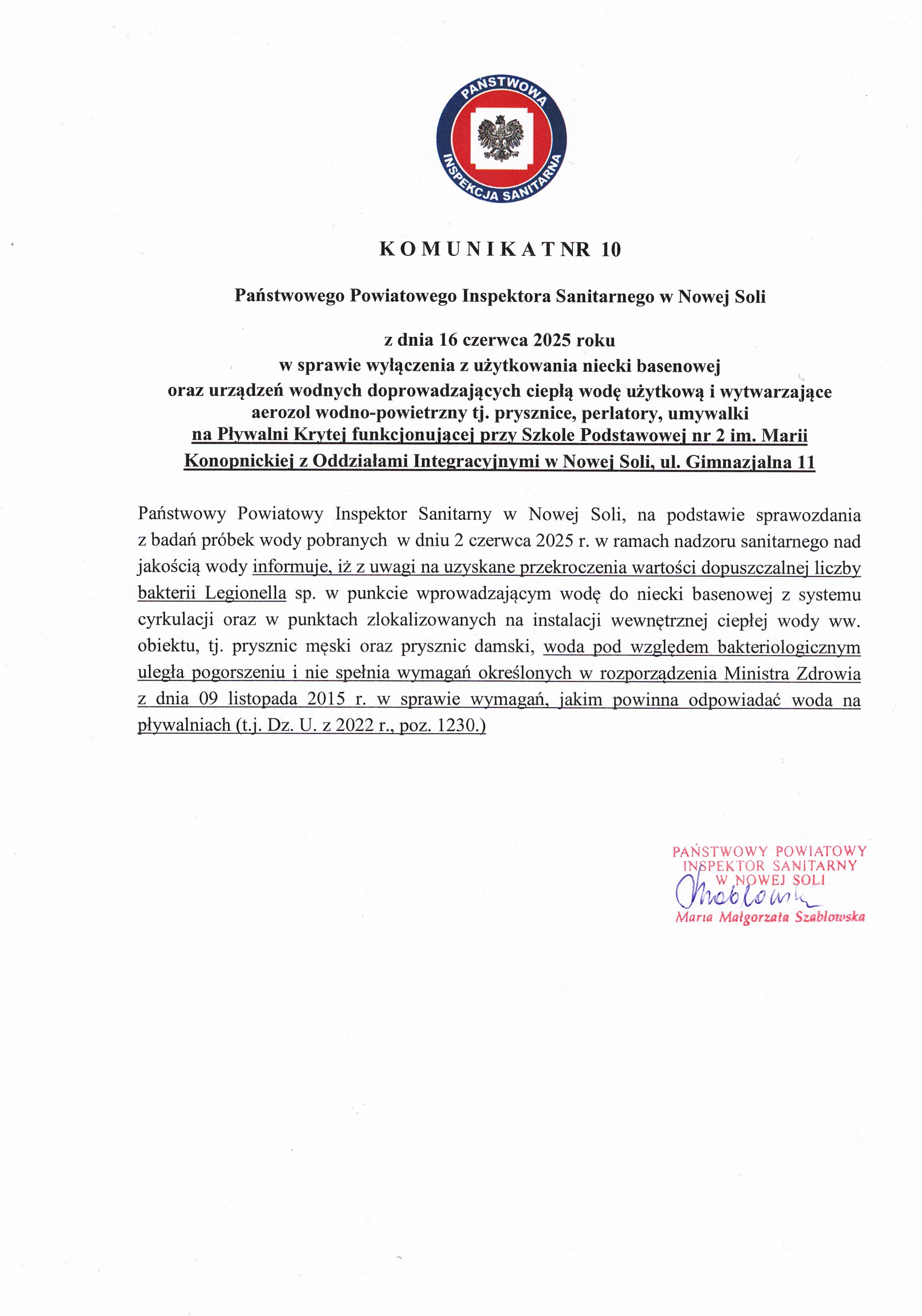 Państwowego Powiatowego Inspektora Sanitarnego w Nowej Soli z dnia 16 czerwca 2025 roku w sprawie wyłączenia z użytkowania niecki basenowej oraz urządzeń wodnych doprowadzających ciepłą wodę użytkową i wytwarzające aerozol wodno-powietrzny tj. prysznice, perlatory, umywalki na Pływalni Krytej funkcjonującej przy Szkole Podstawowej nr 2 im. Marii Konopnickiej z Oddziałami Integracyjnymi w Nowej Soli, ul. Gimnazjalna 11