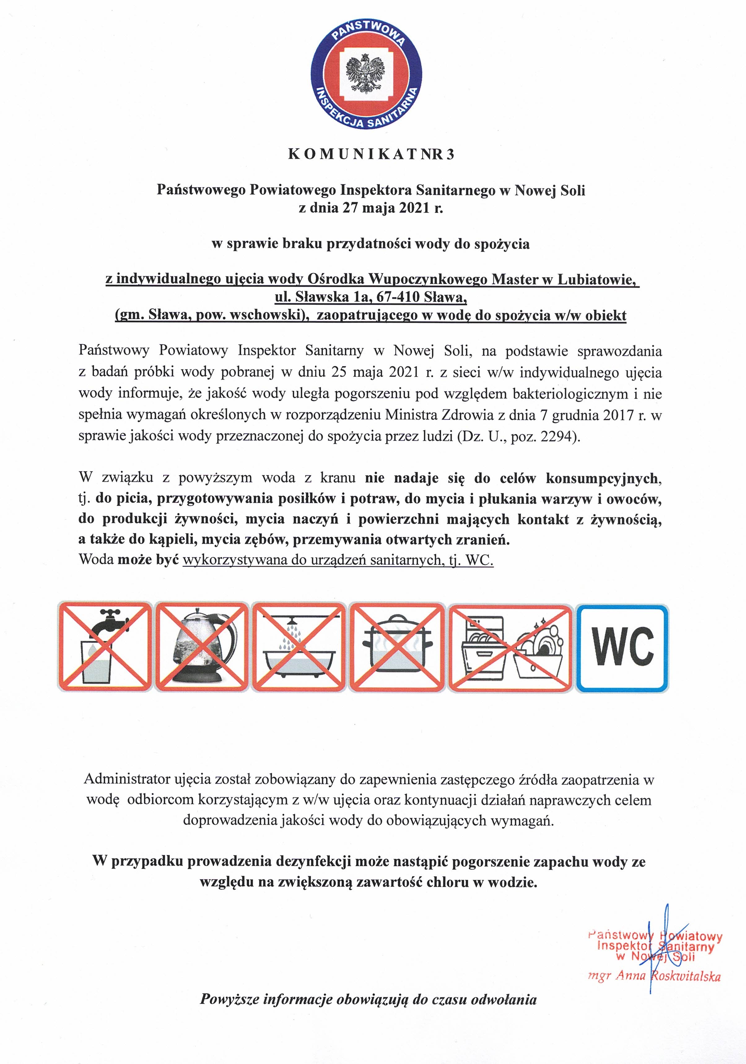 Komunikat nr 3 z 27 maja 2021 r w sprawie braku przydatności wody do spożycia OW Master