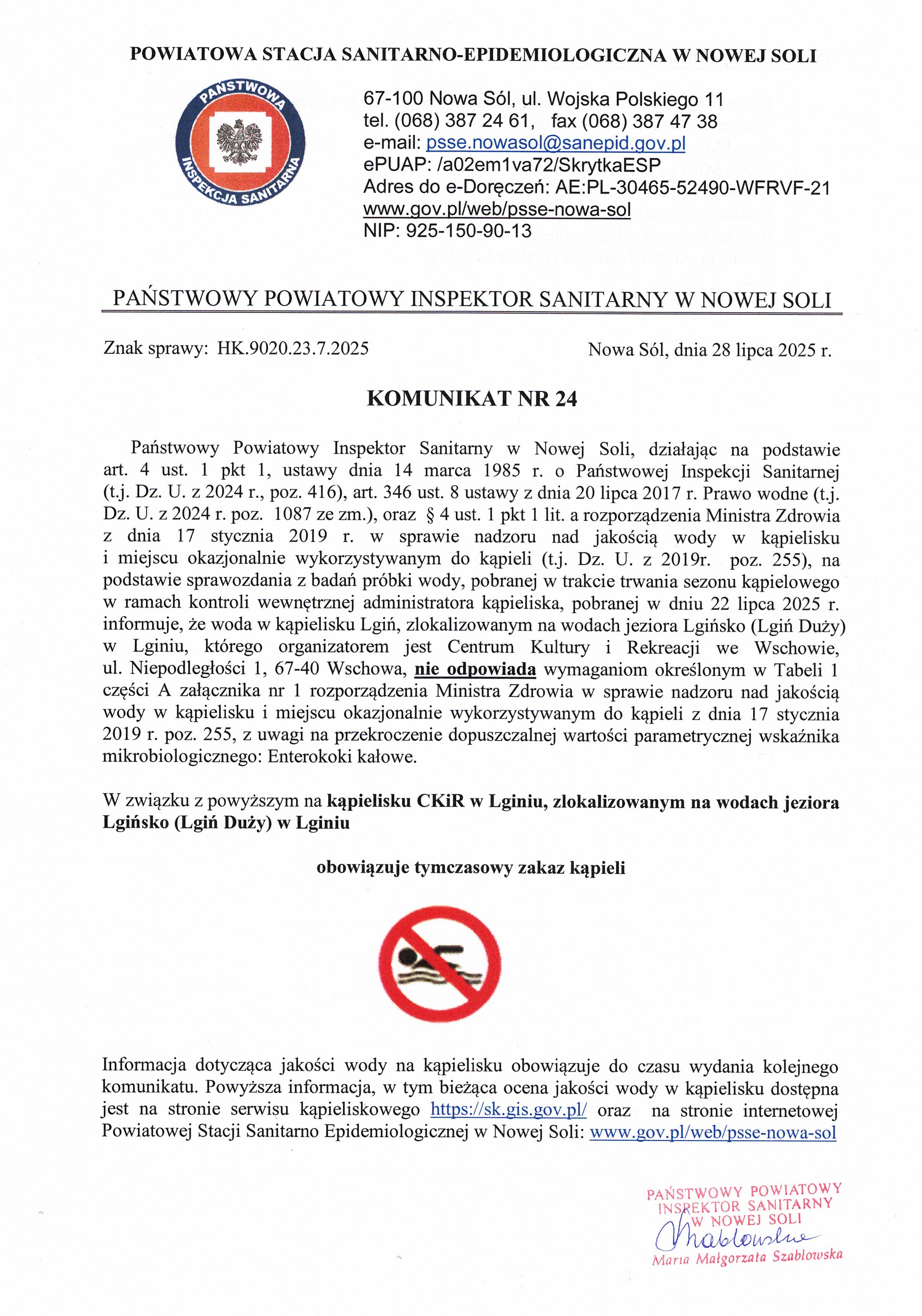 Państwowy Powiatowy Inspektor Sanitarny w Nowej Soli, w sprawie nadzoru nad jakością wody w kąpielisku i miejscu okazjonalnie wykorzystywanym do kąpieli (t.j. Dz. U. z 2019r. poz. 255), na podstawie sprawozdania z badań próbki wody, pobranej w trakcie trwania sezonu kąpielowego w ramach kontroli wewnętrznej administratora kąpieliska, pobranej w dniu 22 lipca 2025 r. informuje, że woda w kąpielisku Lgiń, zlokalizowanym na wodach jeziora Lgińsko (Lgiń Duży) w Lginiu, którego organizatorem jest Centrum Kultury i Rekreacji we Wschowie, ul. Niepodległości 1, 67-40 Wschowa, nie odpowiada wymaganiom określonym w Tabeli 1 części A załącznika nr 1 rozporządzenia Ministra Zdrowia w sprawie nadzoru nad jakością wody w kąpielisku i miejscu okazjonalnie wykorzystywanym do kąpieli z dnia 17 stycznia 2019 r. poz. 255, z uwagi na przekroczenie dopuszczalnej wartości parametrycznej wskaźnika mikrobiologicznego: Enterokoki kałowe.