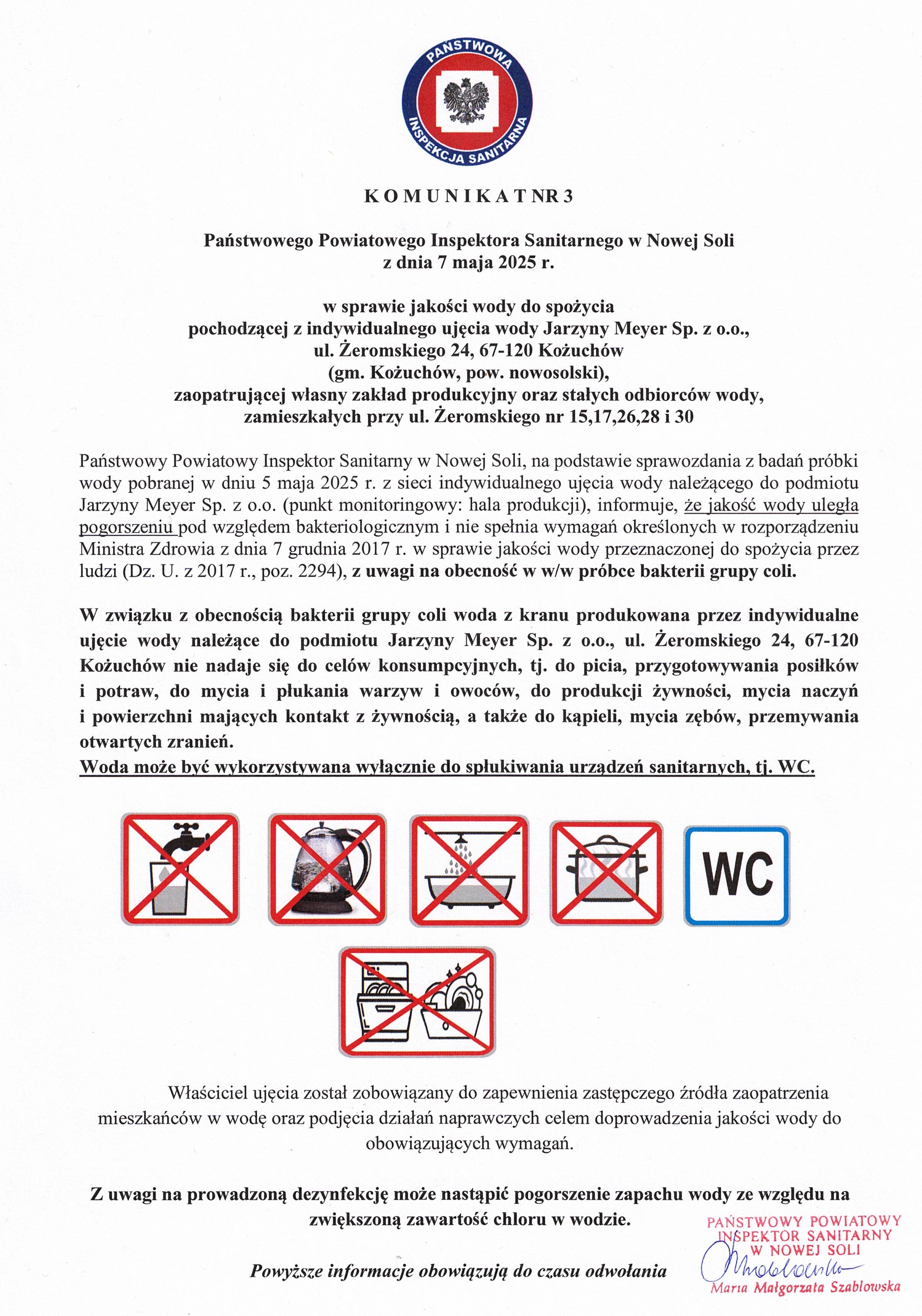 Państwowy Powiatowy Inspektor Sanitarny w Nowej Soli, na podstawie sprawozdania z badań próbki wody pobranej w dniu 5 maja 2025 r. z sieci indywidualnego ujęcia wody należącego do podmiotu Jarzyny Meyer Sp. z o.o. (punkt monitoringowy: hala produkcji), informuje, że jakość wody uległa pogorszeniu pod względem bakteriologicznym i nie spełnia wymagań określonych w rozporządzeniu Ministra Zdrowia z dnia 7 grudnia 2017 r. w sprawie jakości wody przeznaczonej do spożycia przez ludzi (Dz. U. z 2017 r., poz. 2294), z uwagi na obecność w w/w próbce bakterii grupy coli.