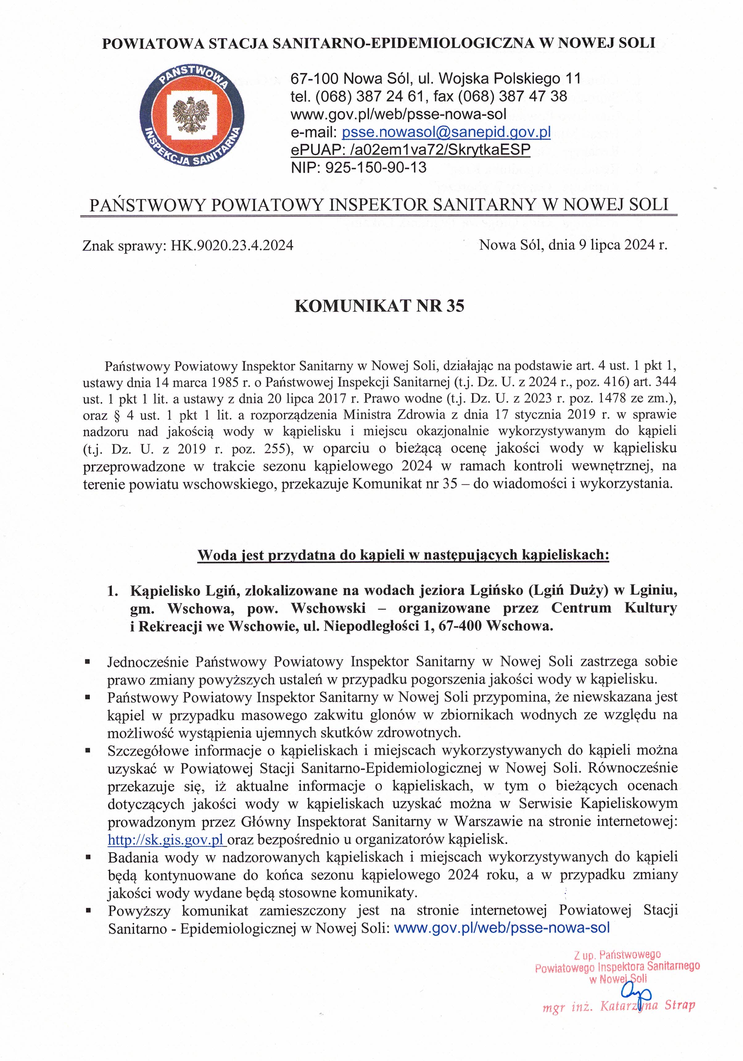 Państwowy Powiatowy Inspektor Sanitarny w Nowej Soli w sprawie nadzoru nad jakością wody w kąpielisku i miejscu okazjonalnie wykorzystywanym do kąpieli, w oparciu o bieżącą ocenę jakości wody w kąpielisku przeprowadzone w trakcie sezonu kąpielowego 2024 w ramach kontroli wewnętrznej, na terenie powiatu wschowskiego, przekazuje Komunikat nr 35.
