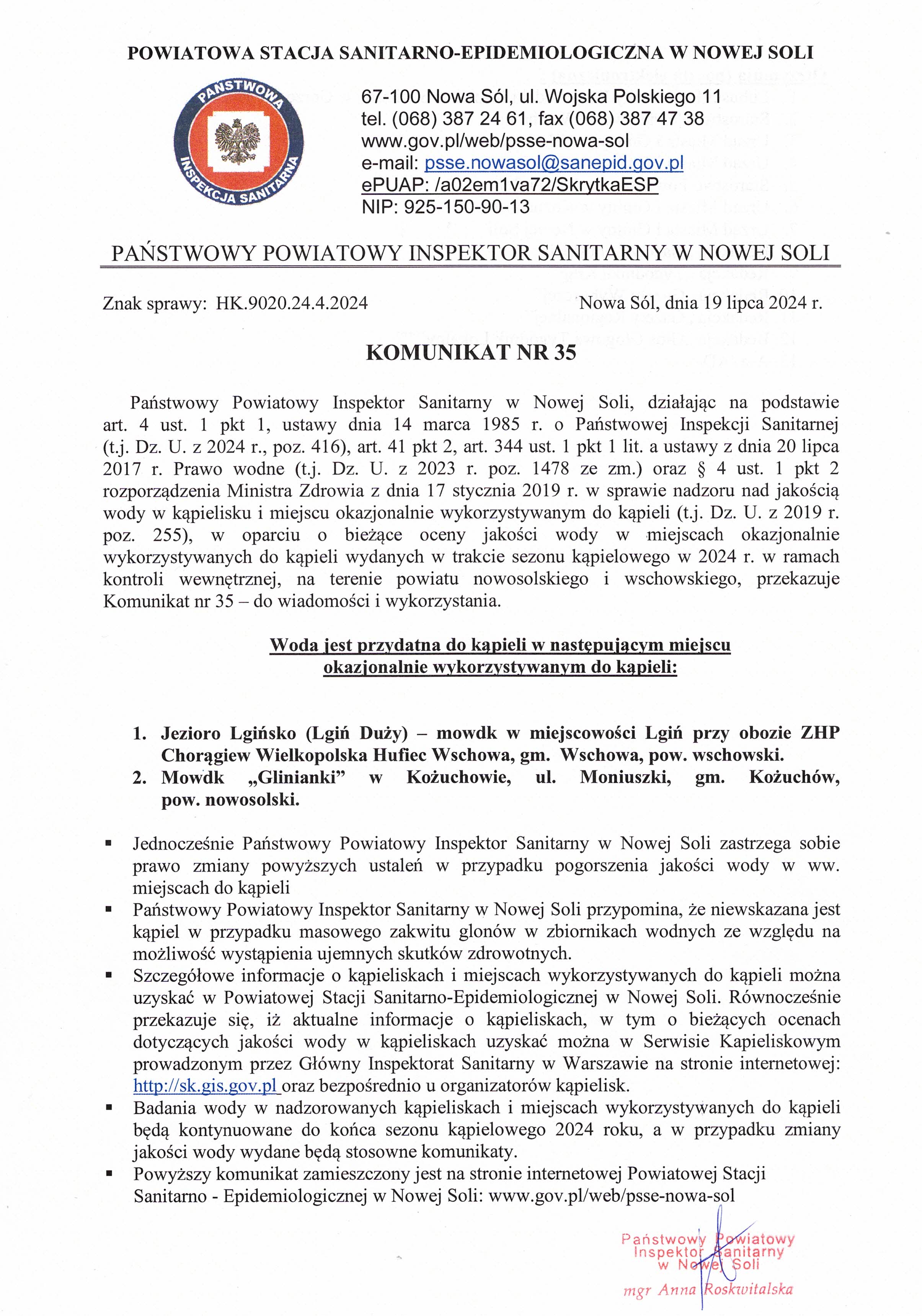 Państwowy Powiatowy Inspektor Sanitarny w Nowej Soli w sprawie nadzoru nad jakością wody w kąpielisku i miejscu okazjonalnie wykorzystywanym do kąpieli, w oparciu o bieżące oceny jakości wody w miejscach okazjonalnie wykorzystywanych do kąpieli wydanych w trakcie sezonu kąpielowego w 2024 r. w ramach kontroli wewnętrznej, na terenie powiatu nowosolskiego i wschowskiego, przekazuje Komunikat nr 36.