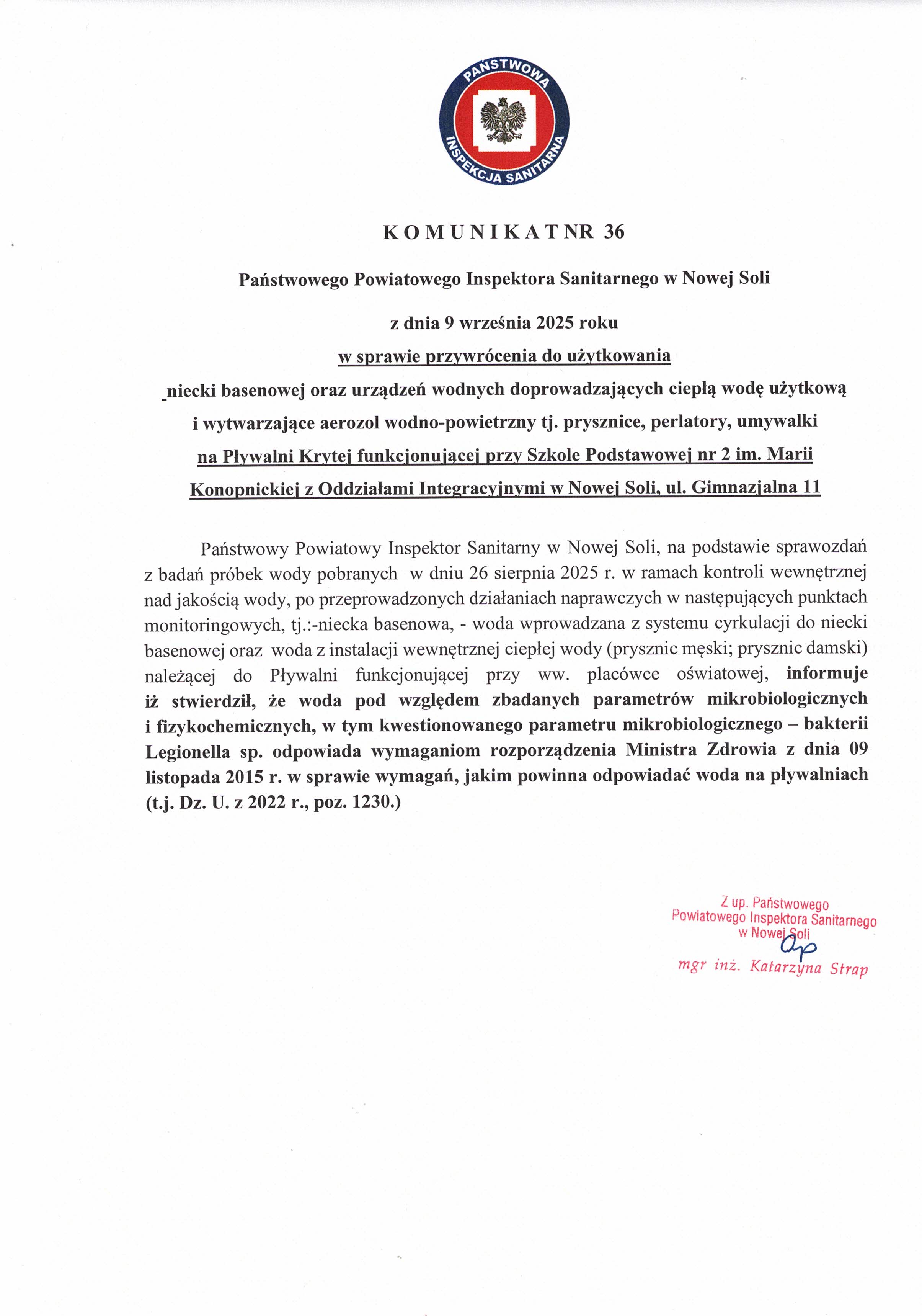 Państwowego Powiatowego Inspektora Sanitarnego w Nowej Soli z dnia 9 września 2025 roku w sprawie przywrócenia do użytkowania niecki basenowej oraz urządzeń wodnych doprowadzających ciepłą wodę użytkową i wytwarzające aerozol wodno-powietrzny tj. prysznice, perlatory, umywalki na Pływalni Krytej funkcjonującej przy Szkole Podstawowej nr 2 im. Marii Konopnickiej z Oddziałami Integracyjnymi w Nowej Soli, ul. Gimnazjalna 11