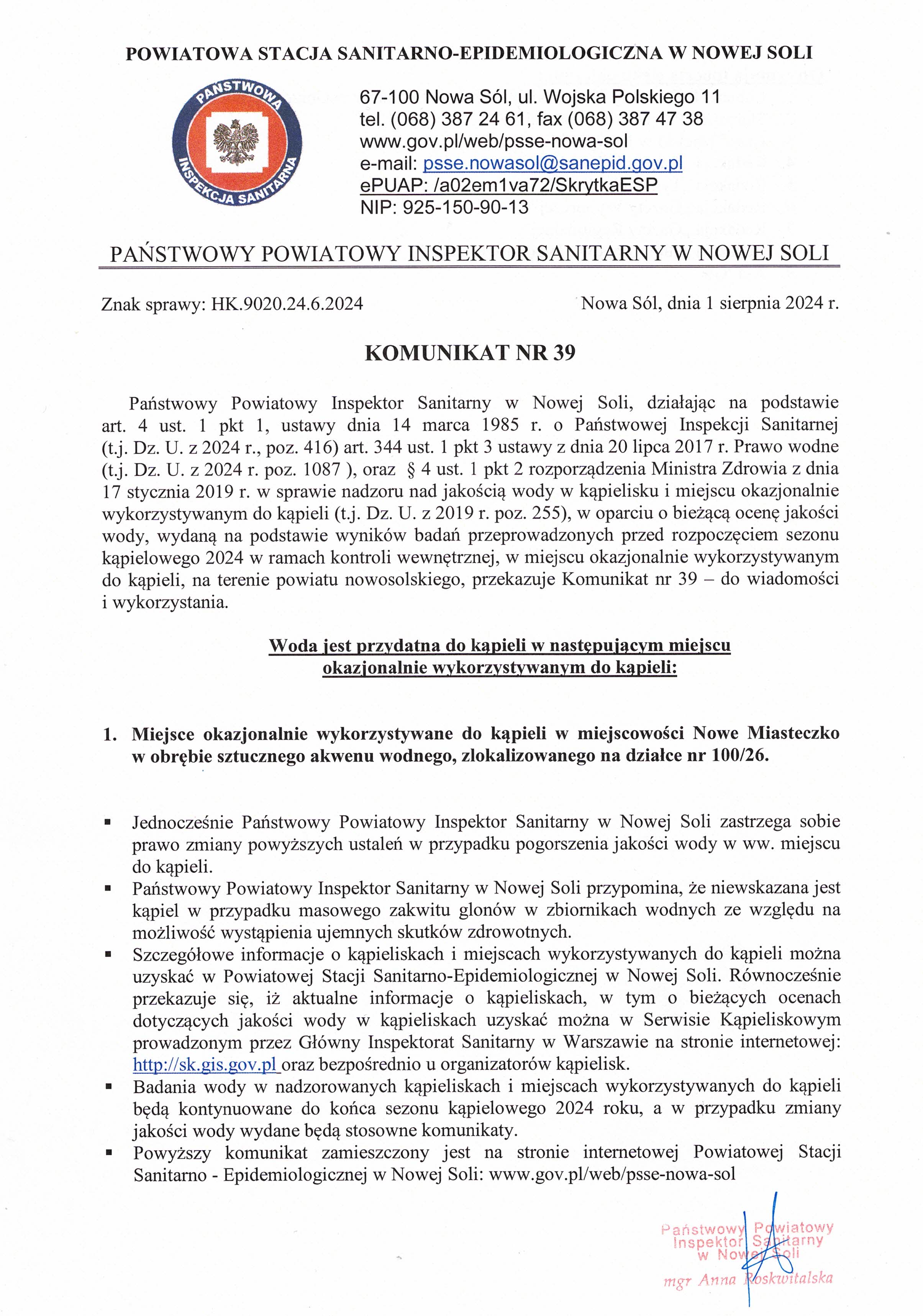 Państwowy Powiatowy Inspektor Sanitarny w Nowej Soli w sprawie nadzoru nad jakością wody w kąpielisku i miejscu okazjonalnie wykorzystywanym do kąpieli, w oparciu o bieżącą ocenę jakości wody, wydaną na podstawie wyników badań przeprowadzonych przed rozpoczęciem sezonu kąpielowego 2024 w ramach kontroli wewnętrznej, w miejscu okazjonalnie wykorzystywanym do kąpieli, na terenie powiatu nowosolskiego, przekazuje Komunikat nr 39.