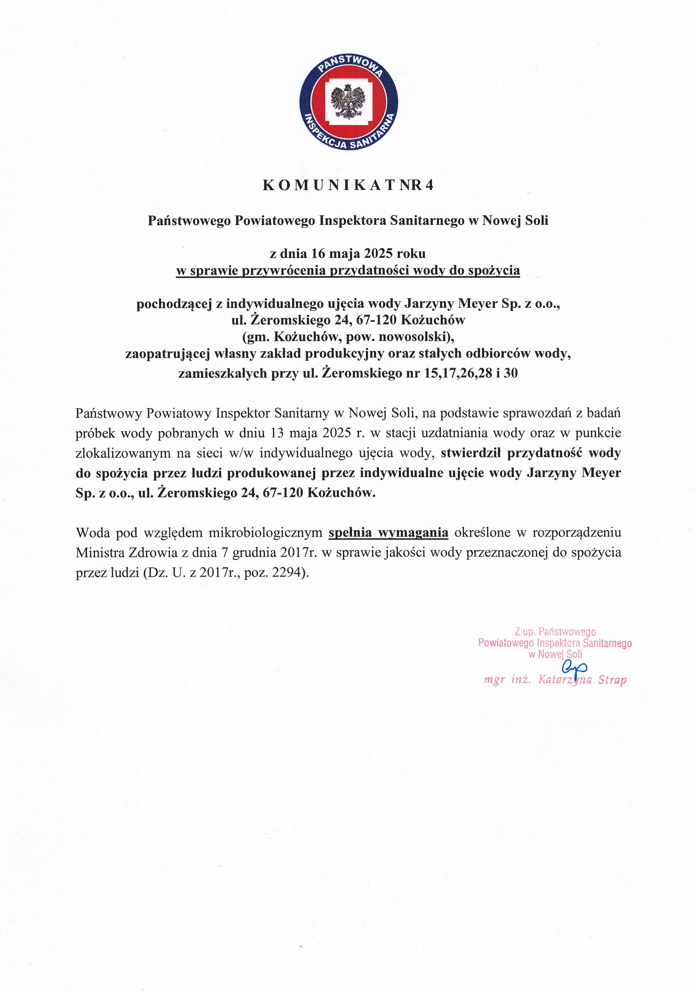 Państwowego Powiatowego Inspektora Sanitarnego w Nowej Soli z dnia 16 maja 2025 roku w sprawie przywrócenia przydatności wody do spożycia pochodzącej z indywidualnego ujęcia wody Jarzyny Meyer Sp. z o.o., ul. Żeromskiego 24, 67-120 Kożuchów (gm. Kożuchów, pow. nowosolski), zaopatrującej własny zakład produkcyjny oraz stałych odbiorców wody, zamieszkałych przy ul. Żeromskiego nr 15,17,26,28 i 30